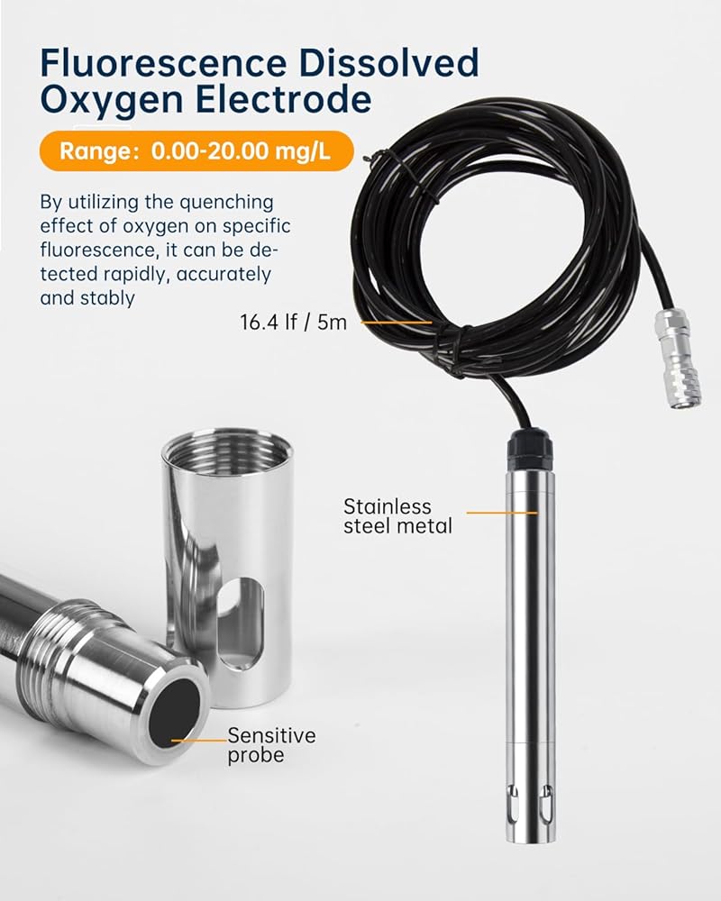Advanced Fluorescence Quenching Method: Our Do Meter is equipped with a fluorescent dissolved oxygen electrode. The material used is stainless steel, and the wire is 16.4 lf long. By utilizing the quenching effect of oxygen on specific fluorescence, it can be detected rapidly, accurately and stably.