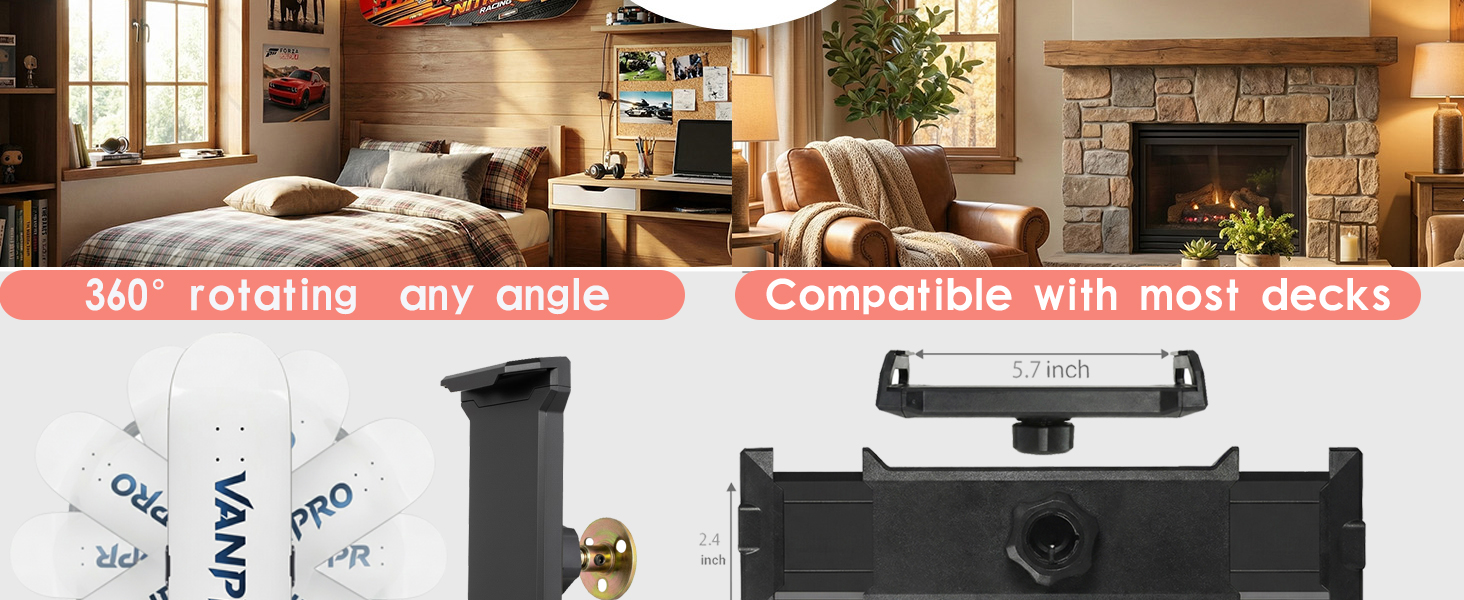 【360° rotating】:360°rotating skateboard wall mounts a ball adapter—that lets you display your deck horizontally, vertically, or at any custom angle without needing tools to adjust it later.