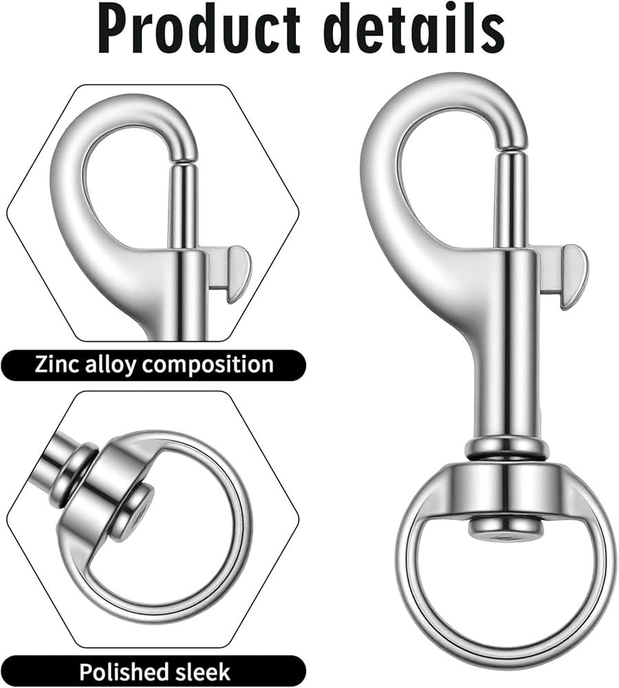 【Durable Material】These swivel snap hooks are constructed from solid zinc alloy, a material known for its strength and longevity. This choice of material ensures the clips are sturdy enough for demanding tasks while providing reliable rust resistance for long-term use in different settings. The careful crafting process results in a smooth finish free of sharp edges, making the clips safe to handle and suitable for attaching to pet collars and leashes without causing any damage or discomfort.