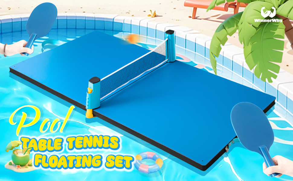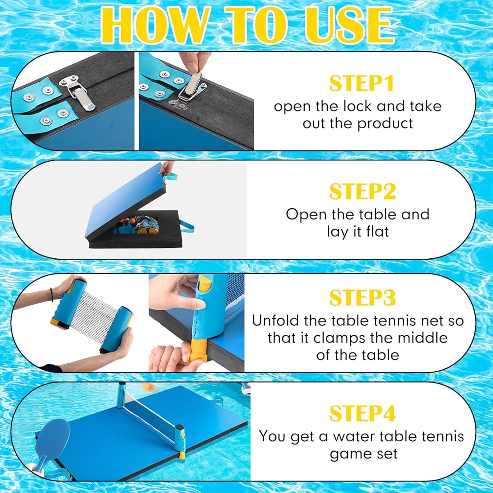 Summer Swimming Games: this foldable table tennis table is made of EVA foam base, waterproof wood top and metal link; Floating tables, table tennis rackets and ball sleeves can meet your needs and turn your pool shore afternoon into a fun and relaxed times