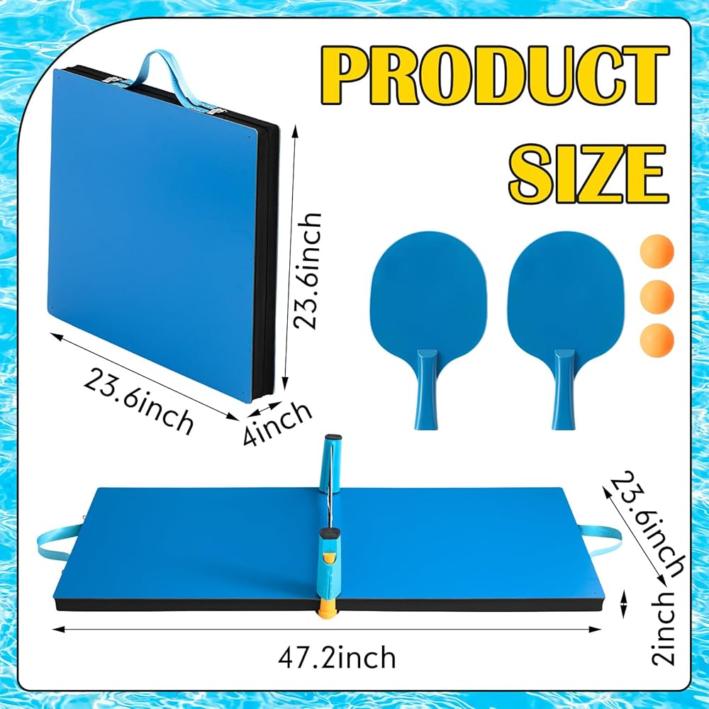 Complete Package: our packaging includes 1 swimming pool floating table with net, the size is about 48 x 24 inches, including 2 table tennis rackets and 3 table tennis, to provide you with a relaxed and pleasant swimming pool table tennis game experience