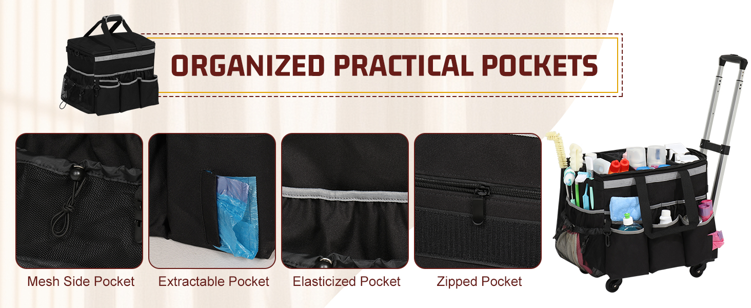 STURDY & WATERPROOF: This rolling cleaning caddy has compact wiring and reinforced stitching to ensure that the bag stands up to daily wear and tear. The surface is made of pvc-coated 900D oxford fabric, which provides excellent waterproof and scratch-resistant properties.