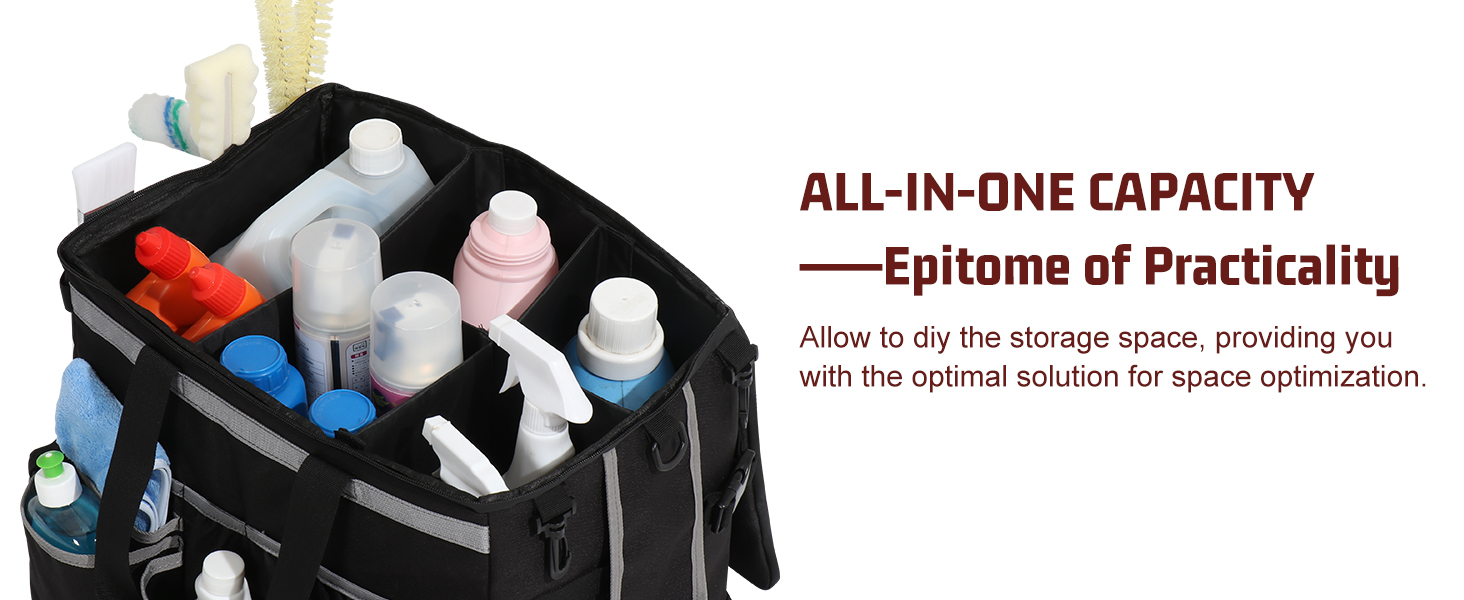 ITEM SIZE: 15.9" L x 13" W x 11.8" H. Easy to use for home, kitchen and outdoor cleaning. This cleaning supplies bag is perfect for storing bottles, brushes, trash bags, dusters, towels, rags, gloves and other cleaning supplies.