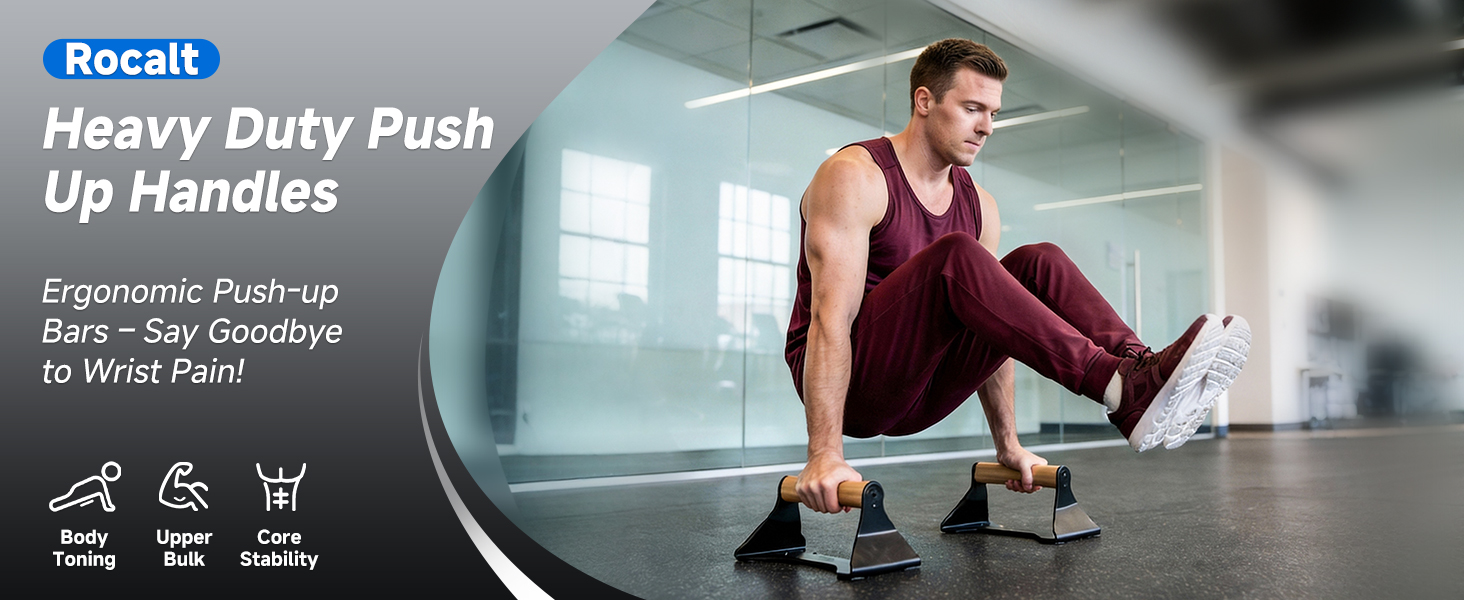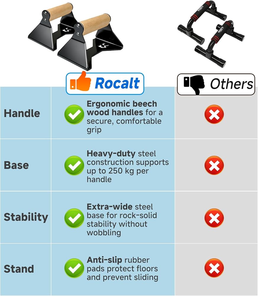 Rocalt Parallettes Push Up Handles - 550LBS Ergonomic Beech Wood Push Up Bars, Heavy Duty Steel Calisthenics Equipment for Home Gym, Anti-Slip Push Up Stands No Wrist Pain