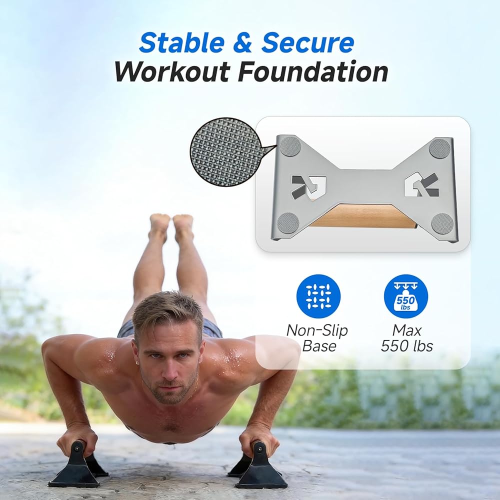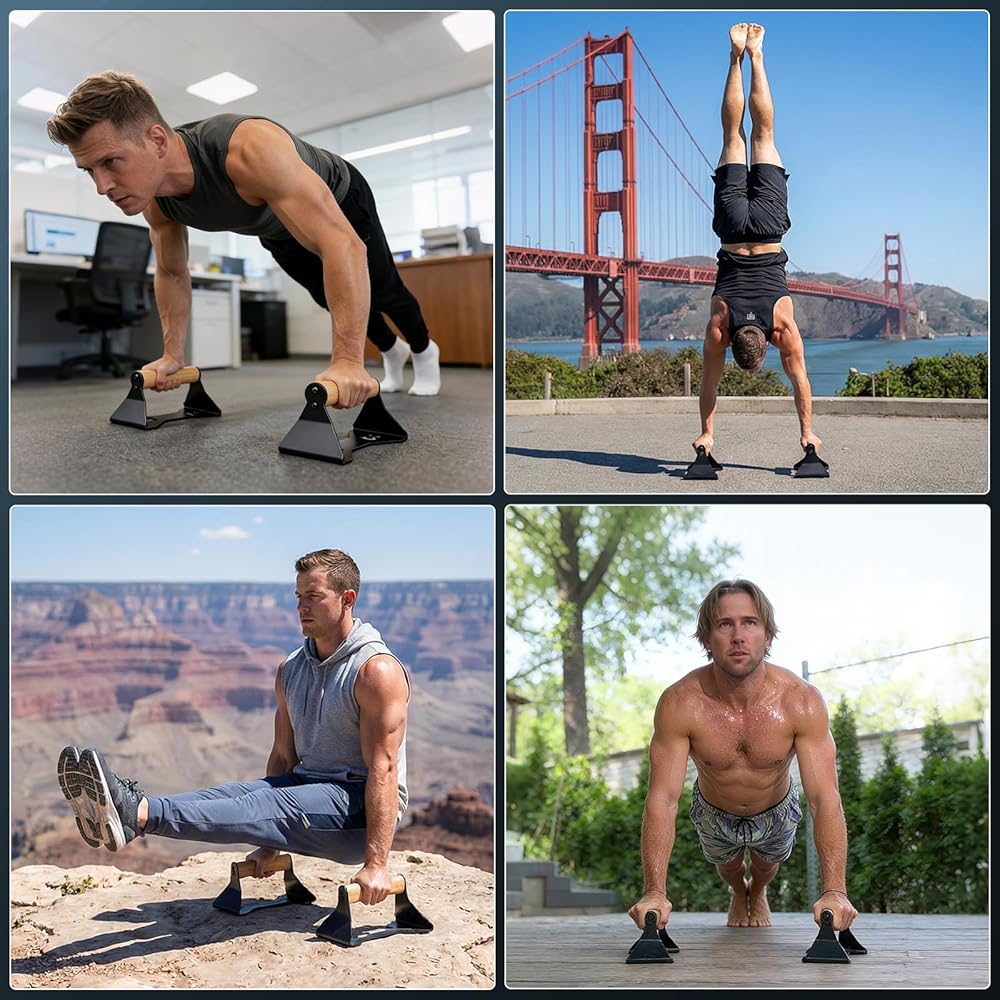 【Heavy-Duty Steel & Wood Parallettes 】 550lbs Weight Capacity! We skip cheap plastic or smelly foam – our push up handle use high-quality alloy steel frames and solid wood, ensuring zero wobble during intense workouts. The anti-slip steel feet lock into place, keeping the pushup bar stable on any floor (home/gym/outdoor) and safe for heavy use