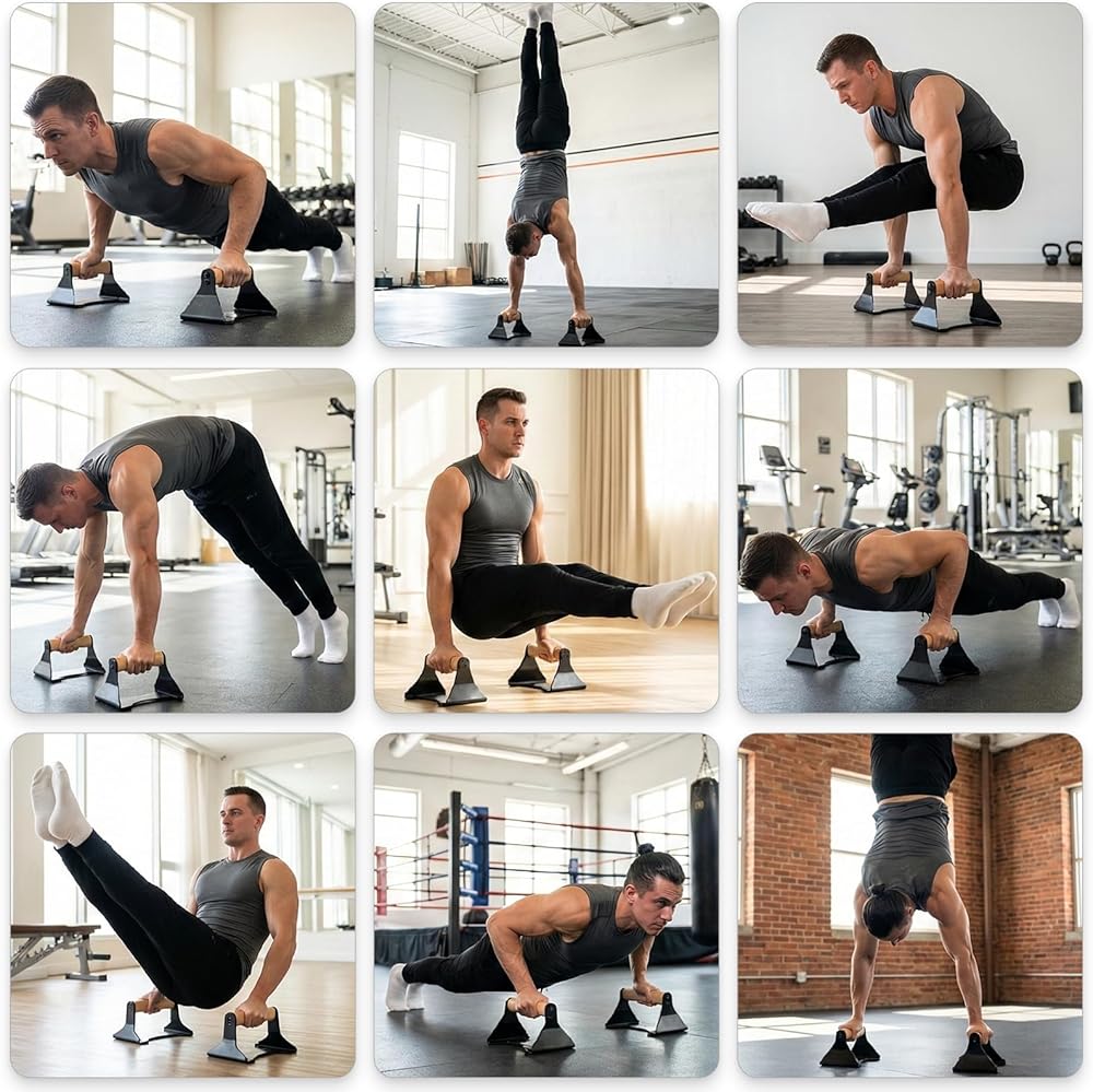 【Versatile Parallettes 】 10+ Bodyweight Exercises! This push up bar isn't just for standard push-ups – use it for one-arm push-ups, seated dips, handstand training, or even tricep extensions