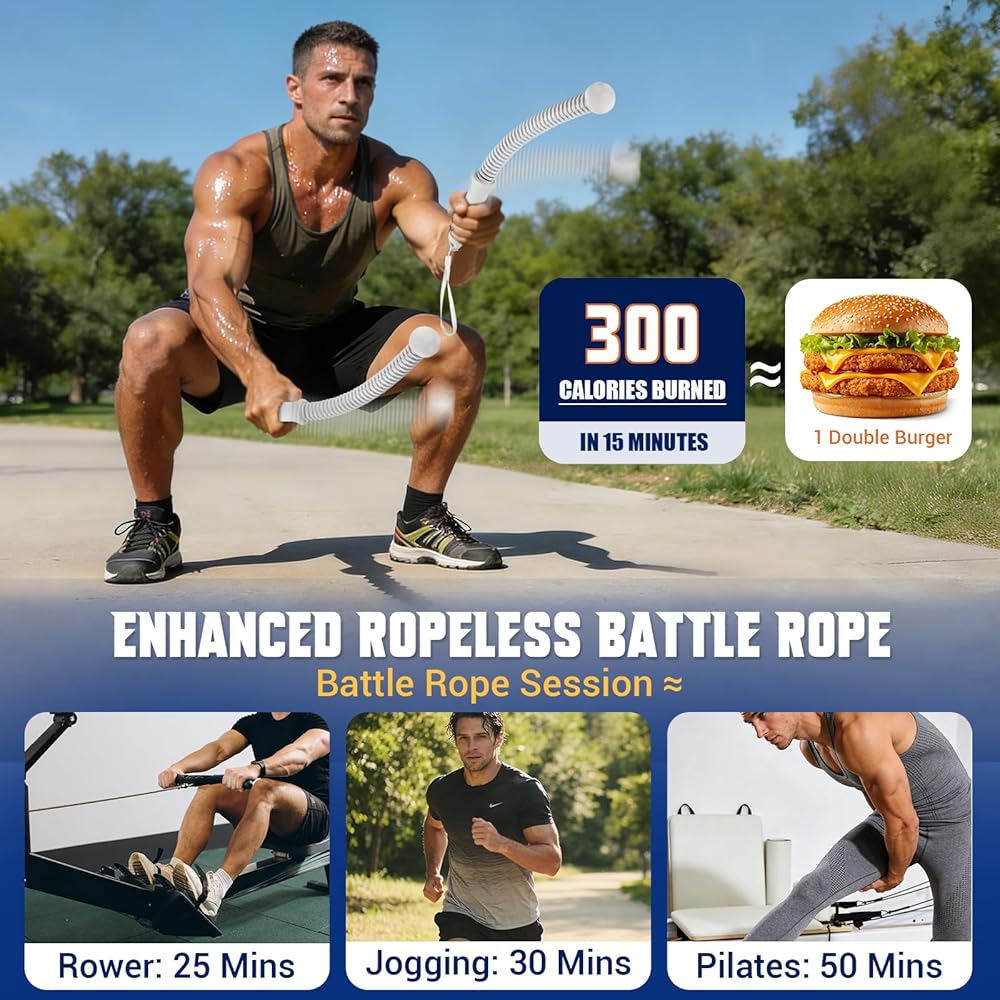 [Efficient Full-Body Workout with Proven Training Equivalence] A focused 15-minute workout using ropeless battle ropes can deliver a training load comparable to 25 minutes of rowing, 30 minutes of jogging, or 50 minutes of Pilates. This efficient system activates arms, shoulders, chest, back, core, hips, and legs. With these cordless battle ropes, users can complete HIIT, fat-burning, and full-body conditioning sessions in less time