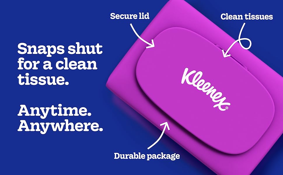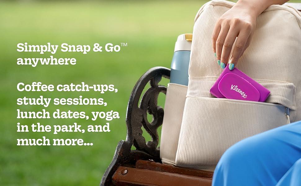 Take Kleenex Snap & Go facial tissues wherever life takes you — this compact, durable pack keeps your tissues clean, secure, and fresh for every moment. Designed for busy lifestyles, Snap & Go fits easily in purses, cars, backpacks, and gym bags, delivering reliable mess containment anytime you need it. These facial tissues provide up to 100% irritation-free skin and help contain messes up to 3x better than the leading value toilet paper. Each Snap & Go pack contains 25 total 3-ply tissues. For whatever happens next, Grab Kleenex. Packaging may vary.