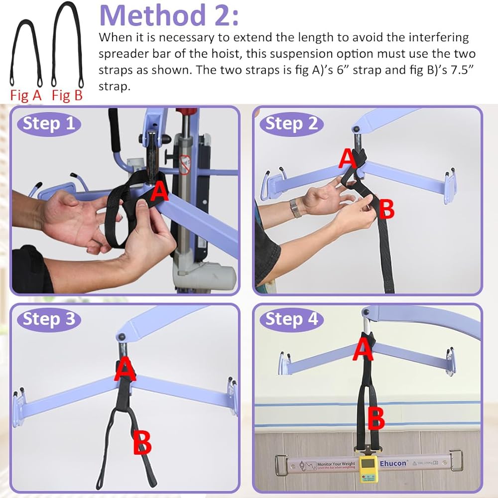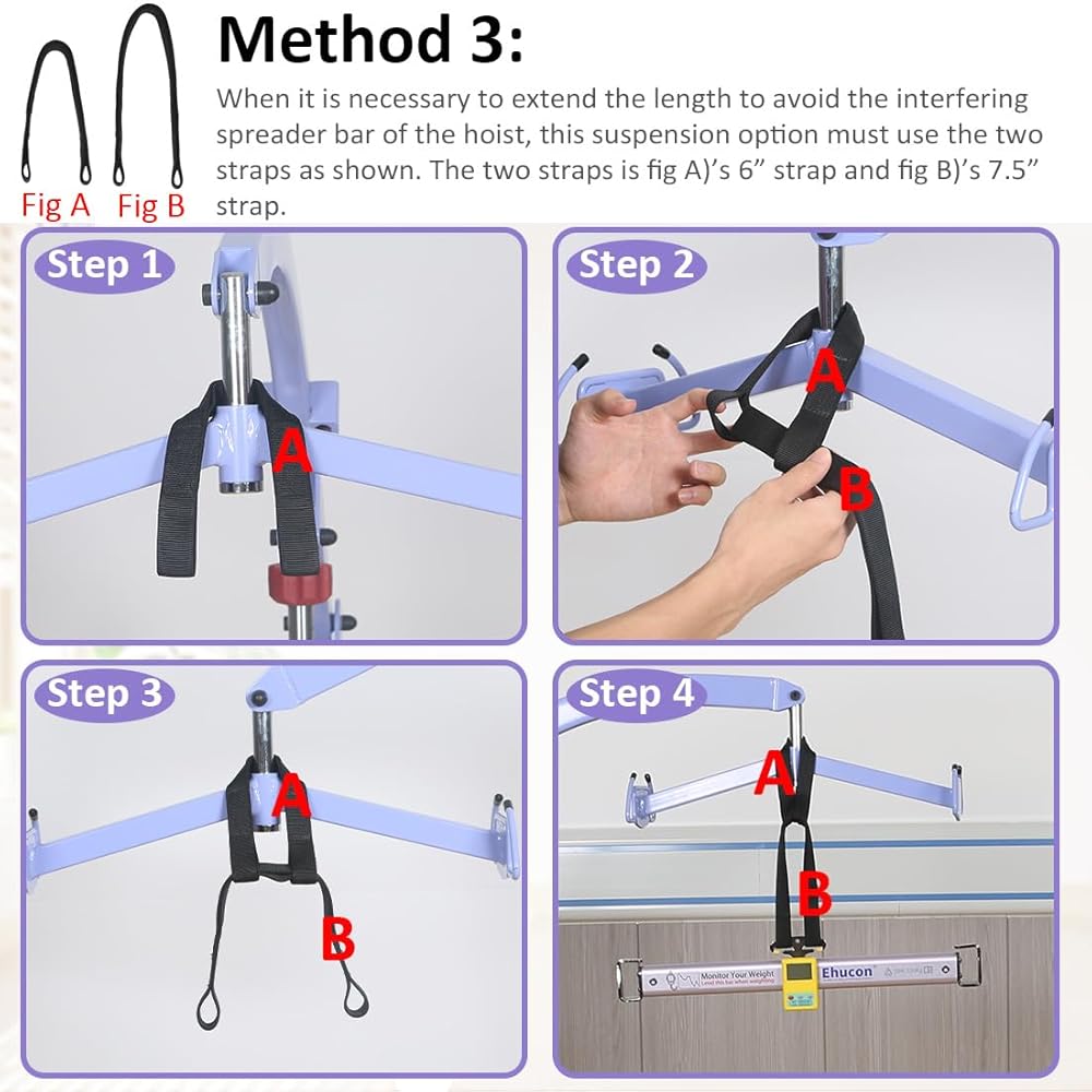 How to Use The Patient Lift Scale: 1.Put the loop of the webbing passes through one hook on the weight scale. 2.Wrap the webbing around the hoist spread bar. 3.Put the other