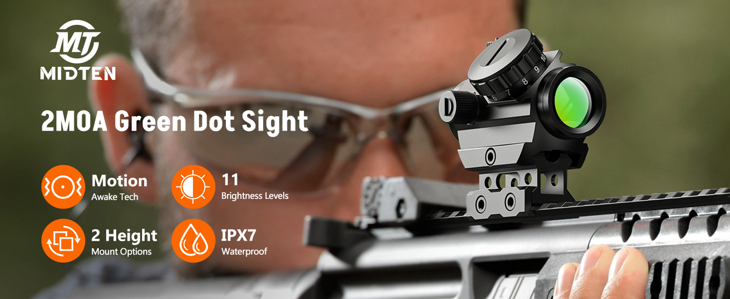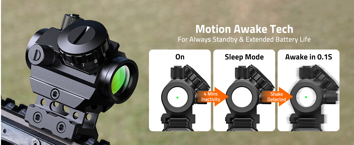 [Motion Awake] - Enhance your experience with our advanced MidTen green dot sight featuring an automatic sleep mode that activates upon motion detection. No need to worry about forgetting to turn it off - the green dot will automatically shut down after 4 minutes of inactivity. When motion is detected, it automatically activates at your last stored brightness setting, ensuring immediate usability.