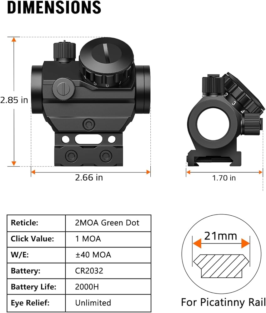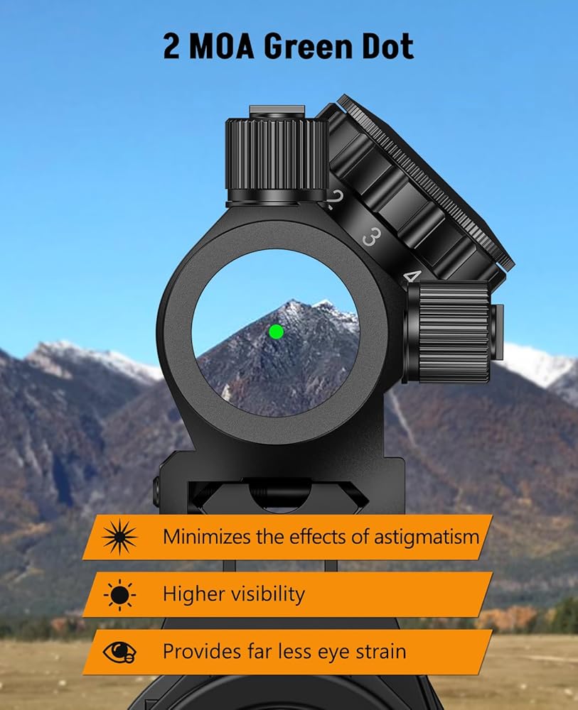 [Green Dot with 11 Brightness Levels] - Green Illumination Technology reduces eye strain compared to red dot scopes and minimizes starburst effects caused by astigmatism for more precise sighting. 11 Brightness Settings provide optimal visibility in most lighting environments, levels 1-5 for dim or rainy environments, levels 6-9 for bright or sunny days, and levels 10-11 are ideal for sunny afternoons.