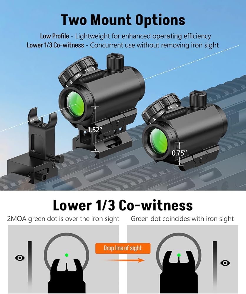 [2 Mount Options] - Low and Lower 1/3 Co-Witness mounts included for seamless fit on 21mm Picatinny rail. 0.86" Riser for Lower 1/3 Co-witness - allows for a more unobstructed field of view and quicker transition from using iron sights to red dot optic; Low Profile - offers efficient operation at close distances, owing to their lightweight design.