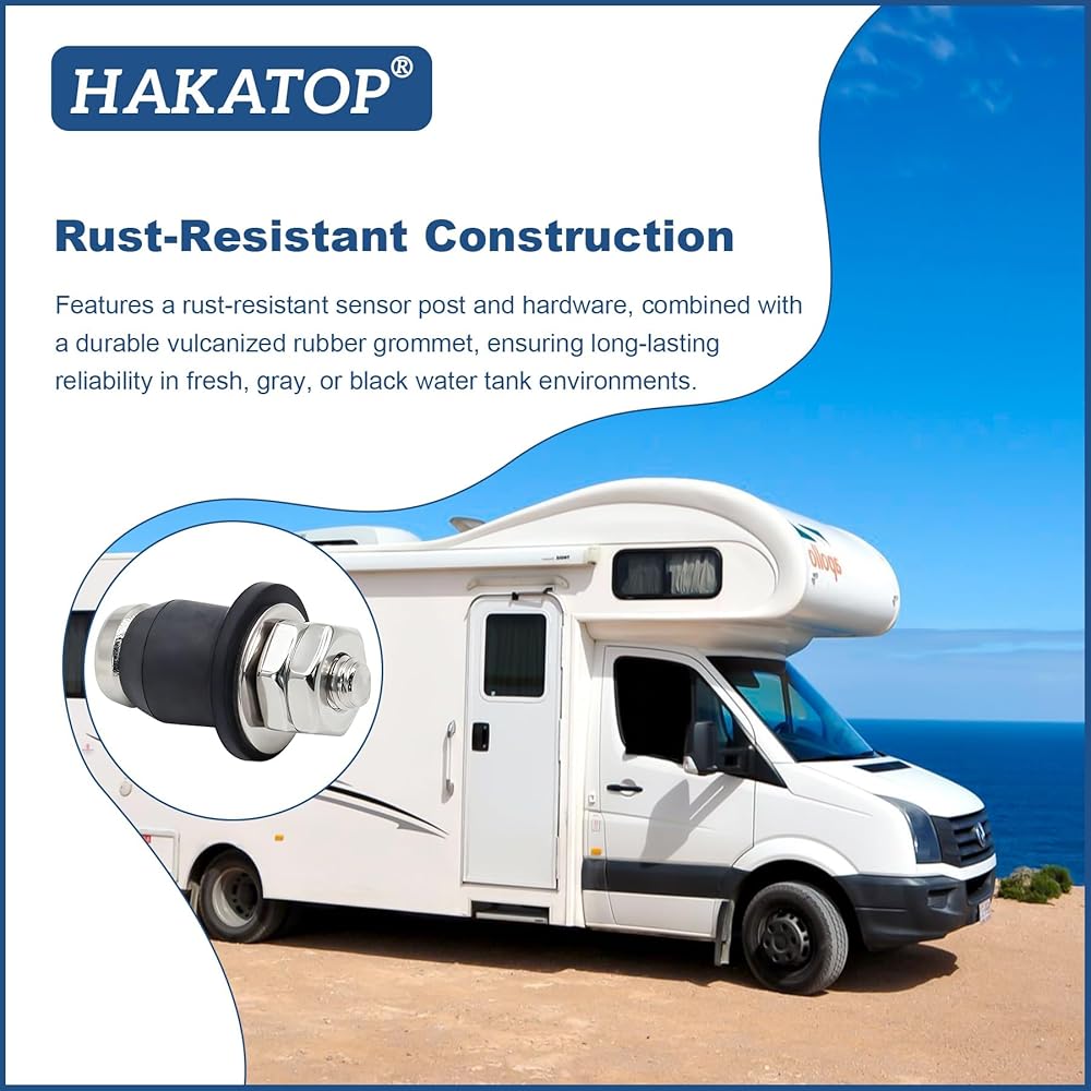 Features a rust-resistant sensor post and hardware, combined with a durable vulcanized rubber grommet, ensuring long-lasting reliability in fresh, gray, or black water tank environments.
