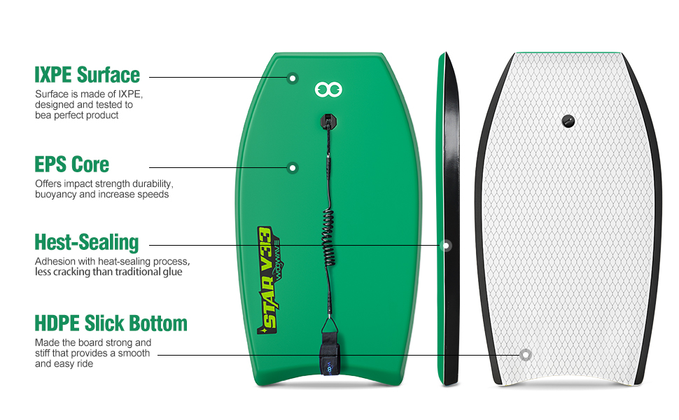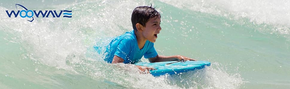 DURABLE CONSTRUCTION AND LIGHTWEIGHT:The WOOWAVE Body Board is super light, comes with coiled wrist leash, features a high speed EVA surface, EPS core and HDPE slick bottom surface for great performance, offers impact strength durability, buoyancy and increase speeds.