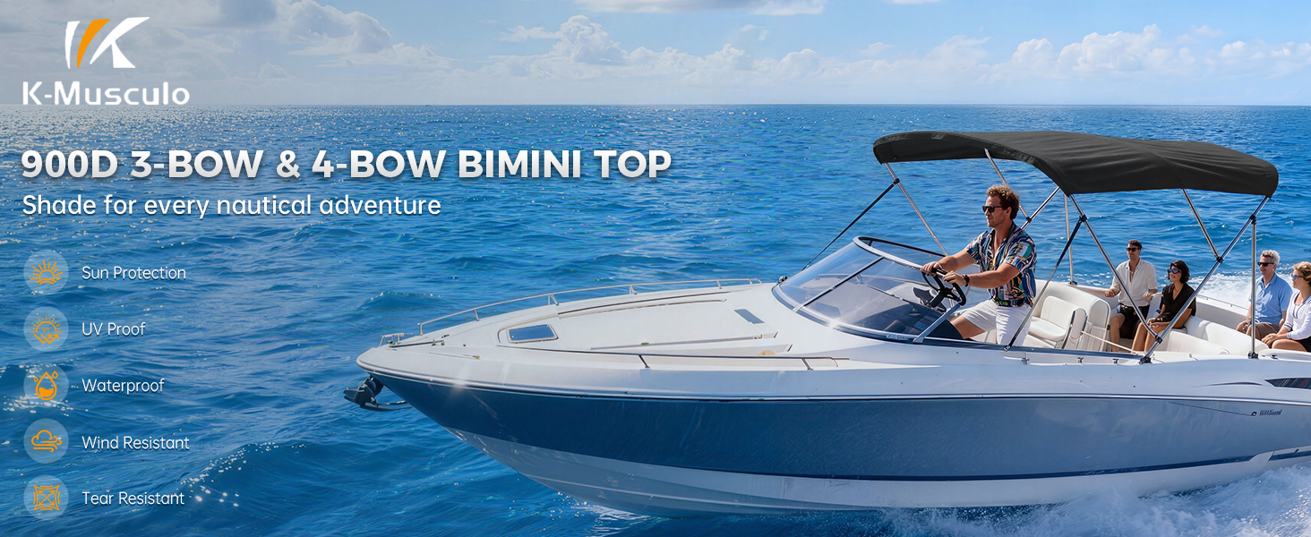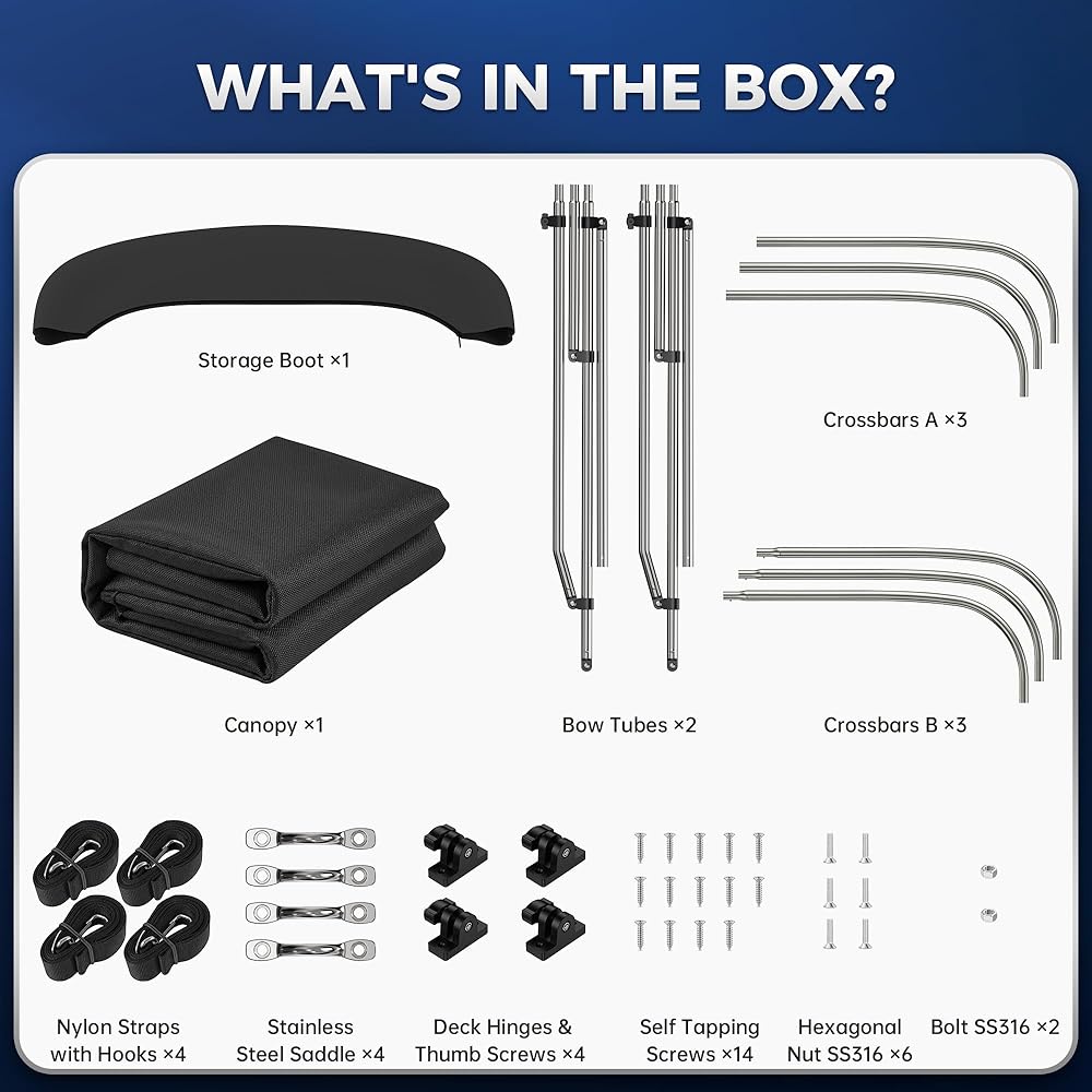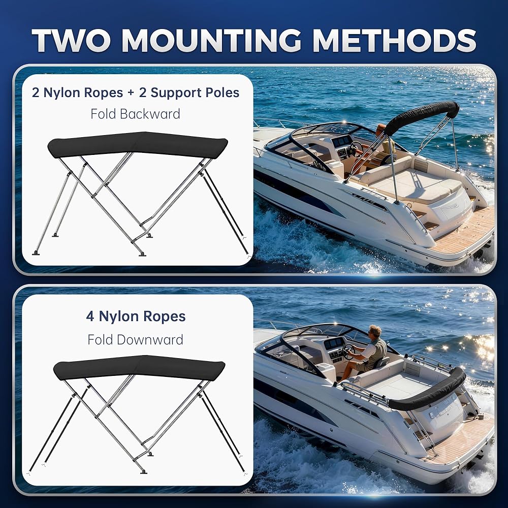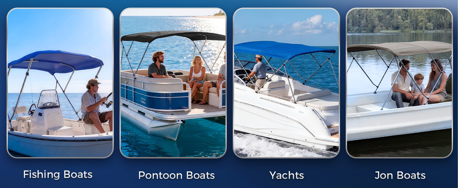 【Multiple Sizes for All Boat Types】Our bimini top offers multi-size 3-bow & 4-bow frames + adjustable width, compatible with all mainstream boat models on the market including Jon boats, pontoon boats, fishing boats, bowriders and bass boats. Simply measure your boat's deck width to select the perfectly fitted bimini tops for boats.