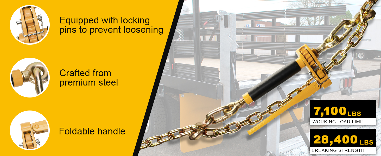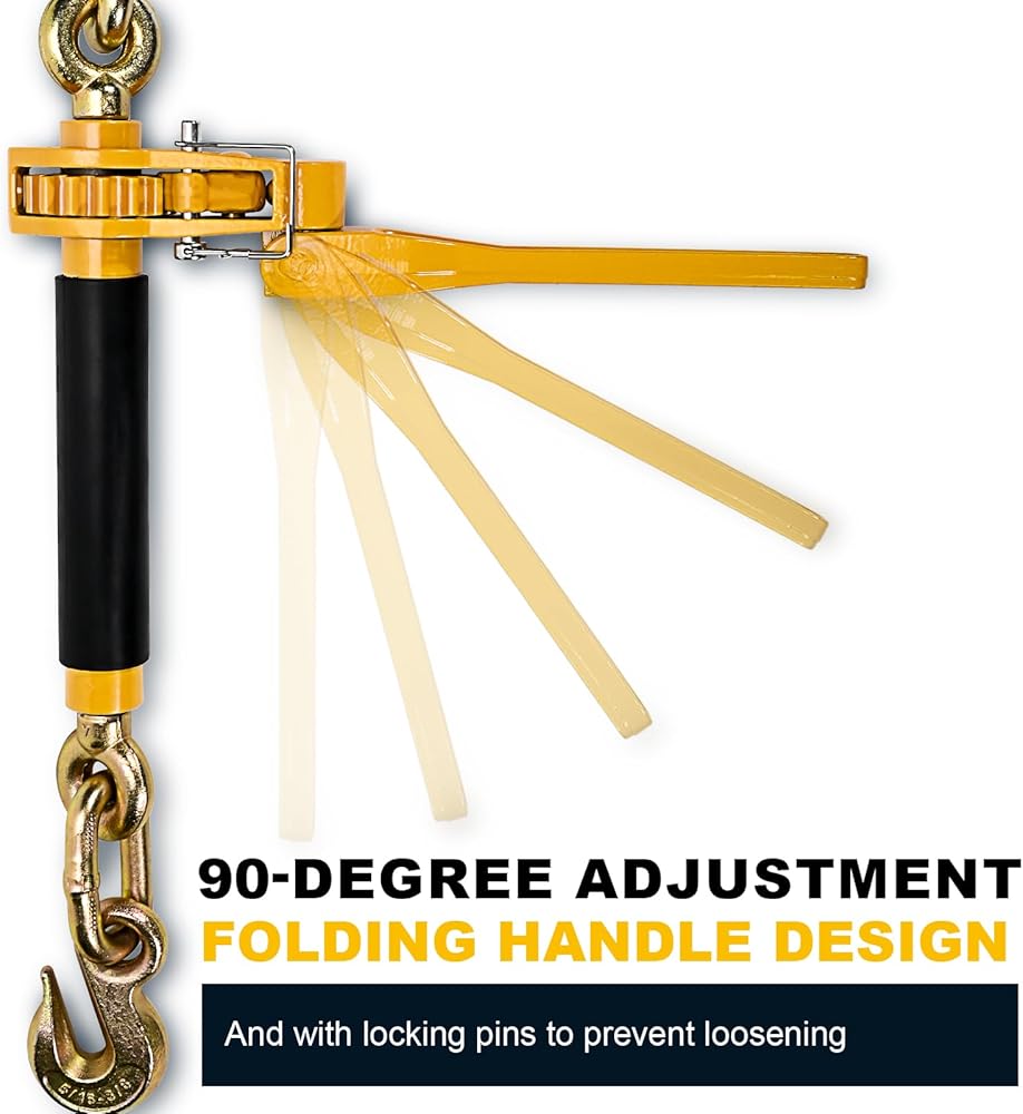 DURABLE AND EASY TO USE: The carbon steel construction and folding handle of the ratchet binder ensure durability and ease of use.the heat treated grade 70-T80 hooks are intended to stand up to rigorous field use and harsh weather conditions.provide a higher safe working load, zinc-dichromate plating provides corrosion resistance, this ratchet chain binder are strong, durable, easy to tension and easy to store