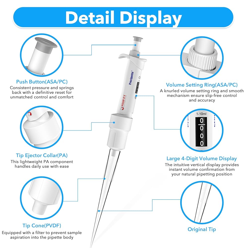 Precise Volume Control: This 10ml pipette, with a dispensing volume range of 1-10ml in 10μl increments, features a large, easy-to-read 4-digit display for superior precision compared to standard 3-digit screens, and is compatible with most universal pipette tips