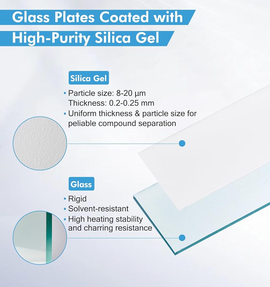 Glass Backed TLC Plate: SiO₂·nH₂O layer inert to most acids or bases (excluding strong alkalis and HF). Rigid glass backing ensures excellent solvent resistance