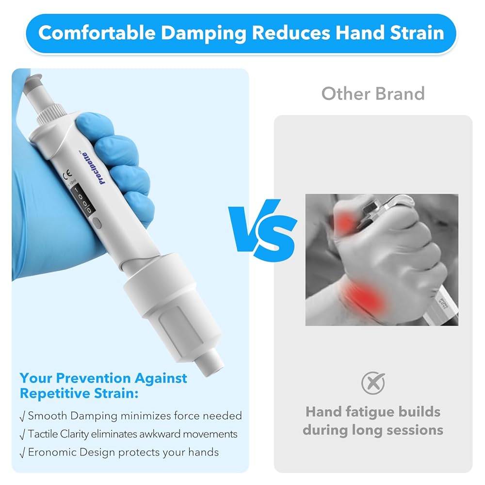 Ergonomic Pipette Design (107g): Ultra-lightweight construction minimizes fatigue during extended use. The contoured shape ensures a secure, comfortable grip, while the internal SUS304 stainless steel spring enables smooth pipette operation with low button force, reducing the risk of Repetitive Stress Injury (RSI)