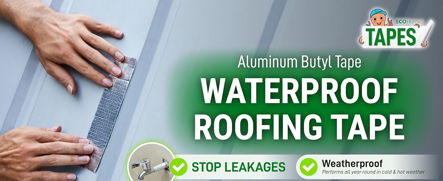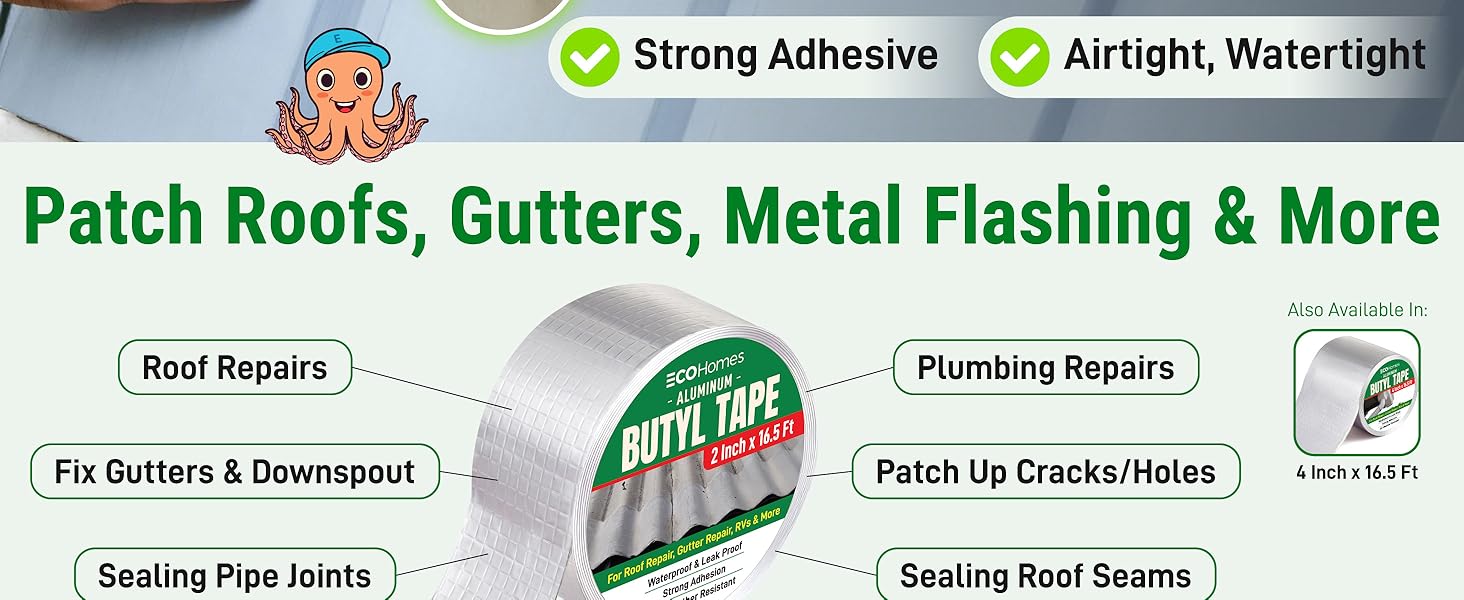 PATCH ROOFS, GUTTERS, METAL FLASHING & MORE: ECOHomes versatile butyl tape creates a strong bond on almost any surface, including metal, concrete, brick tile, wood, glass & plastic. This makes it the ultimate all-in-one solution for countless projects: patch roofs & gutters, repair RVs & boats, fix pipes, seal windows and HVAC systems.