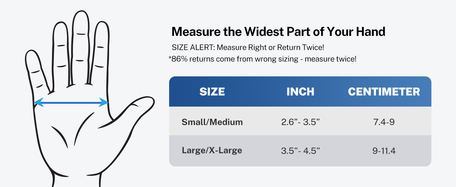 How to select correct size? Measure the widest part of your hand. Size Chart: S/M (2.6"-3.5"), L/XL (3.5"-4.5"). Fit both hands