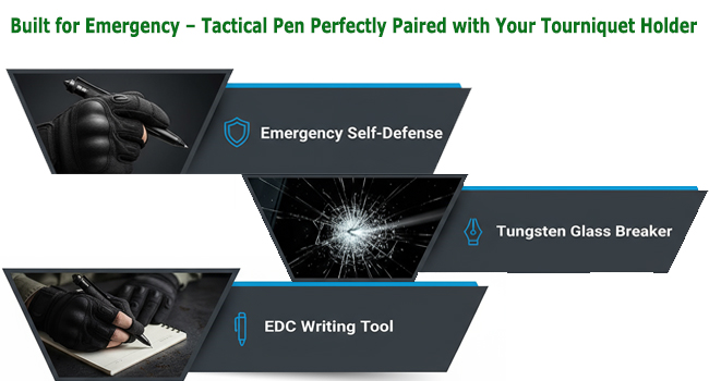 [Professional 2-in-1 Tactical Integration]:Engineered for elite first responders, this horizontal elastic TQ holder integrates a dedicated slot for the included tungsten steel tactical pen. Streamline your duty belt by combining hemorrhage control and critical incident documentation into one compact, high-access footprint.