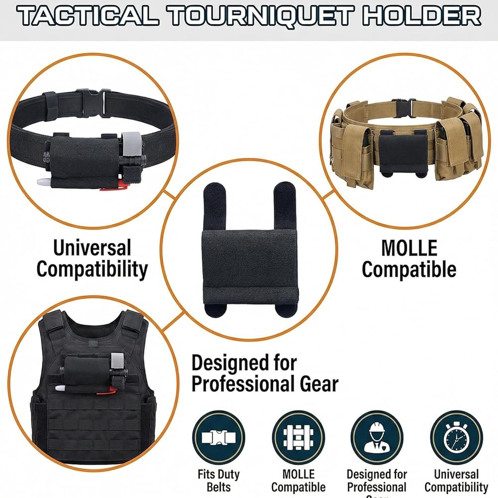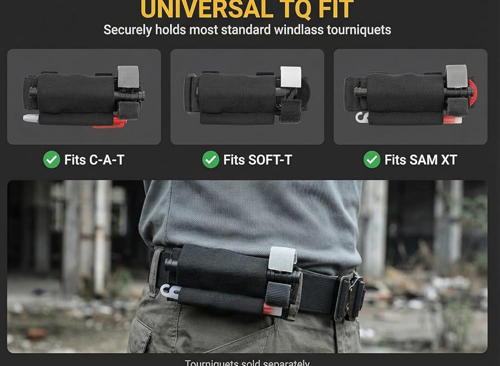 [Flexible & Universal Fit]: Elastic tourniquet pouch stretches to fit most standard tourniquets, Compatible with CAT, SOFTT-H, SOFTT-W, EMT, SAM XT, and more.. Separate compartments securely hold a tourniquet and marker for quick, reliable deployment.