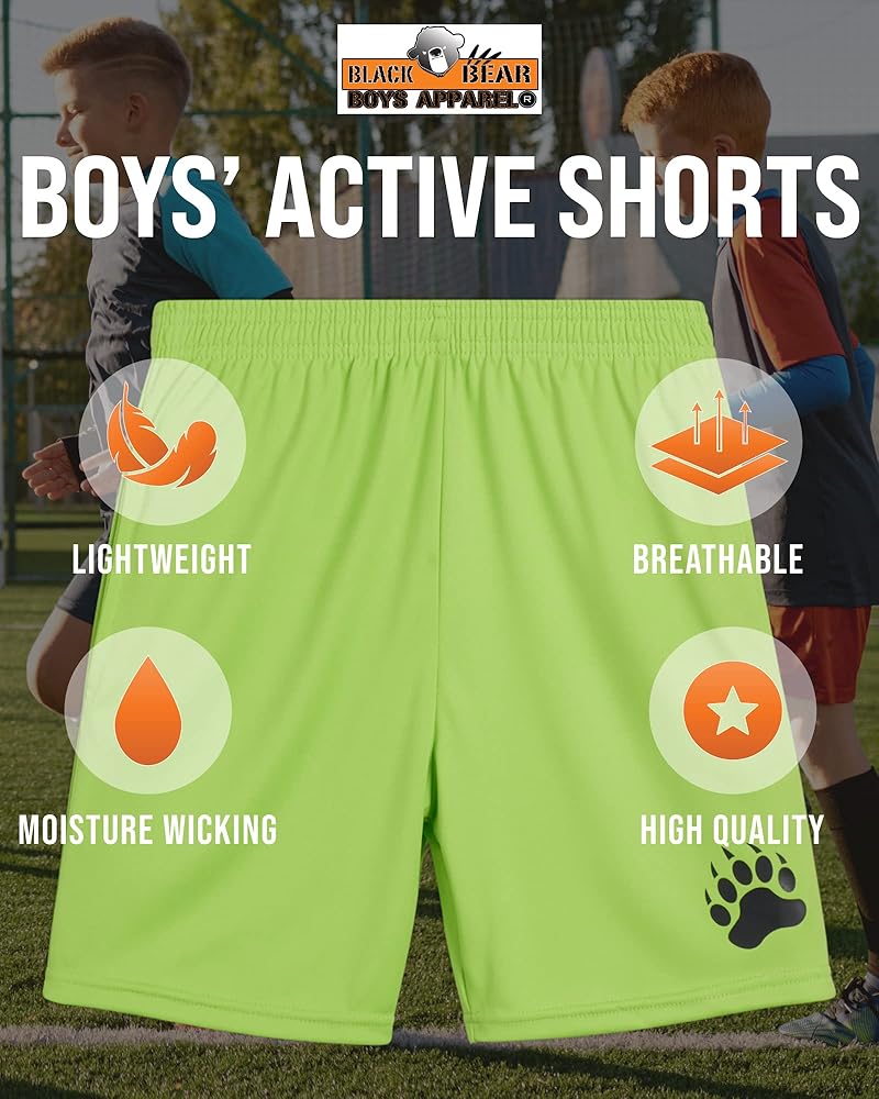 Black Bear Boys' Active Shorts – 4 Pack Performance Dry-Fit Athletic Shorts are sure to improve his game whether he's in the classroom or at the gym. The quick dry performance material is a great choice to keep your son cool and dry all summer long. Easy for kids of all ages to wear thanks to a convenient slip-on design.