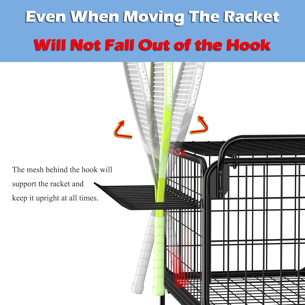 Multi-purpose- With 2 rows of hooks to hold multiple adult or kid's rackets, tennis towels, hats, running ladders, etc., and lower level to store training equipment such as tennis bags, ball hopper, tennis ball pressurizer,tennis score keeper, etc