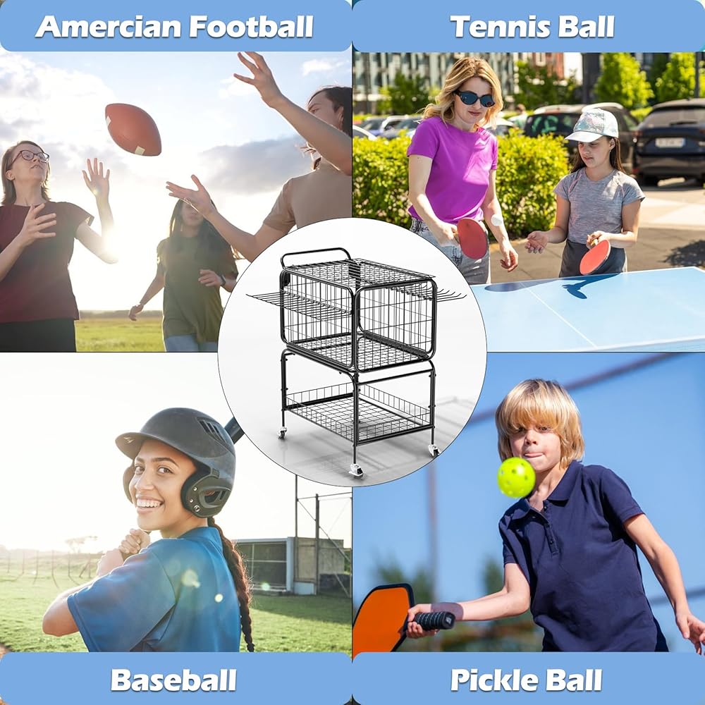 Sturdy Material - The tennis cart is made of high quality carbon steel material, very sturdy and durable, stand the test of time, not easy to deform or collapse, you don't have to worry about easy damage like fabric storage