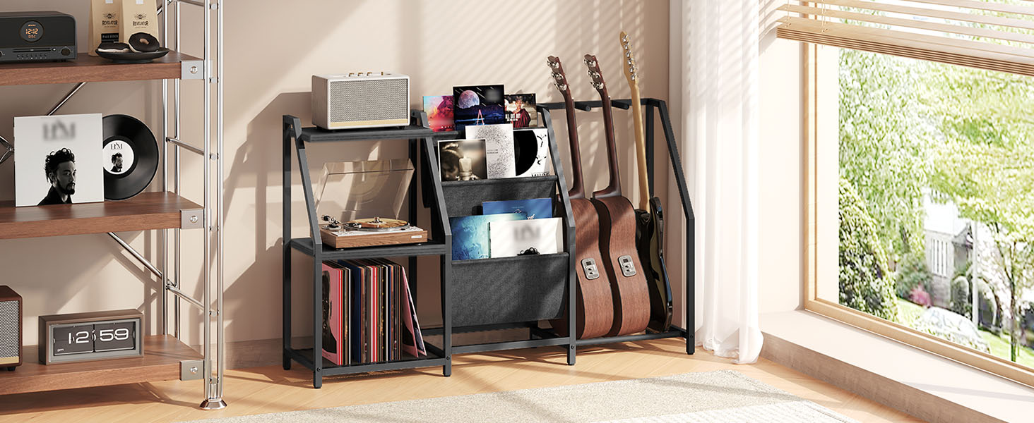 Multi-Functional Storage: With 3 storage sections, this guitar rack is ideal for showcasing your guitars. The middle sling Oxford fabric pouches hold vinyl records and albums, while the left 3-tier shelf places your record player, speakers, or other guitar accessories