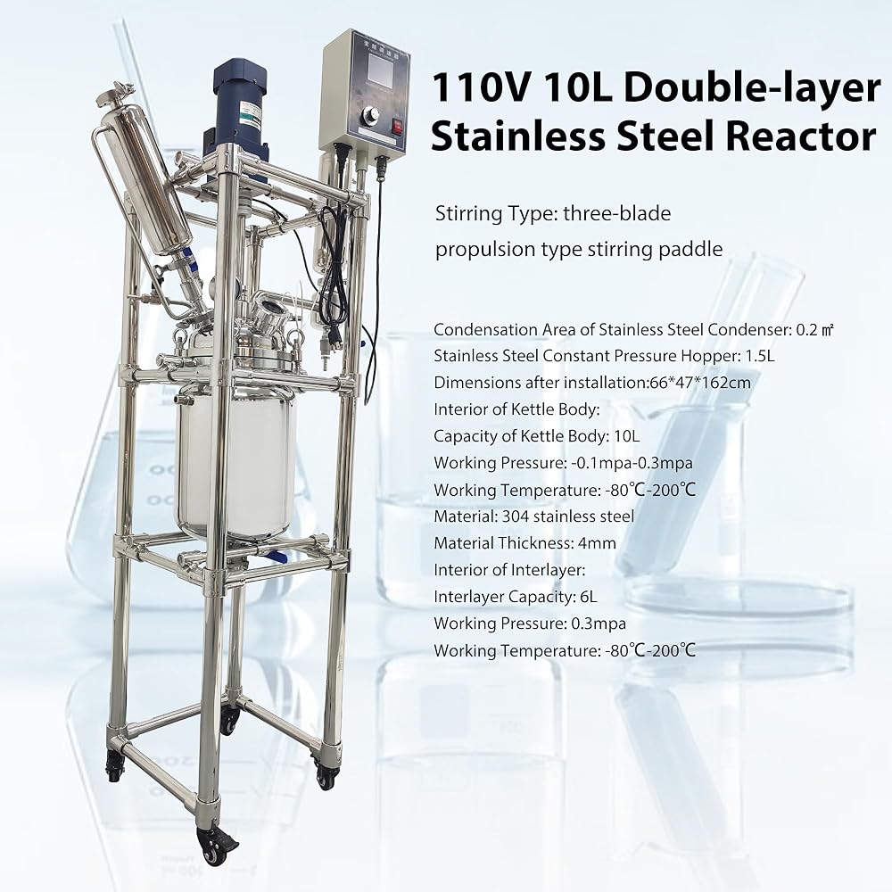 10L Lab Jacketed Reactor 110V Double-Layer Stainless Steel Reaction Kettle, 316 SS Interior, 0-600 RPM, -80°C~200°C, with Digital Display, for Chemical Distillation, Mixing, Research