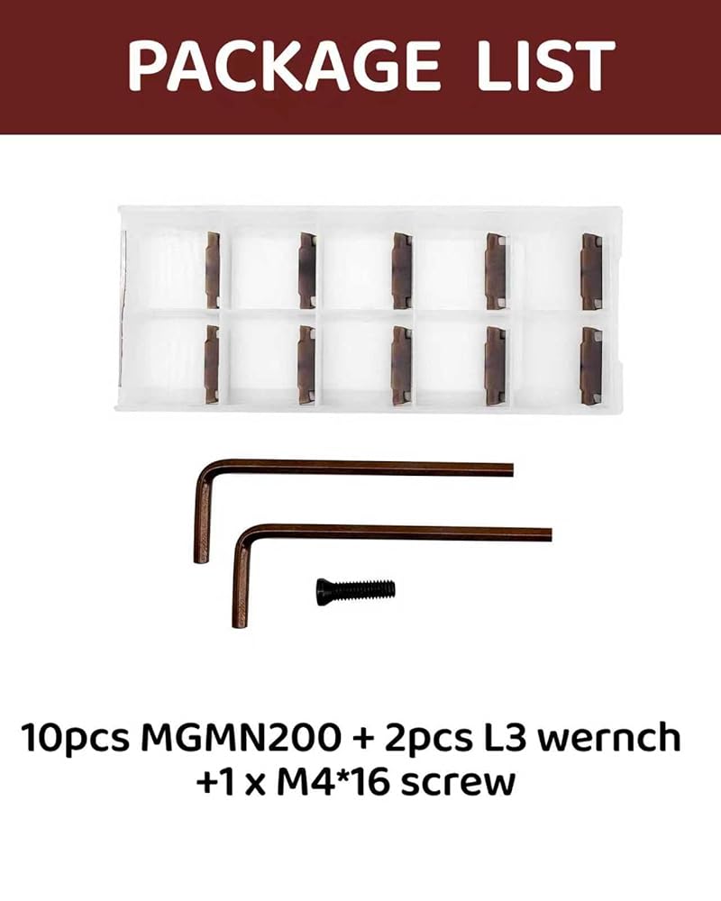 Get started immediately with everything included: 1x MGEHR1010-2 Tool Holder (10mm Shank), 10x MGMN200-G Inserts (2mm Width), 2x L3 Wrenches, and 1x M4*16 Screw. This comprehensive package offers exceptional value and convenience.