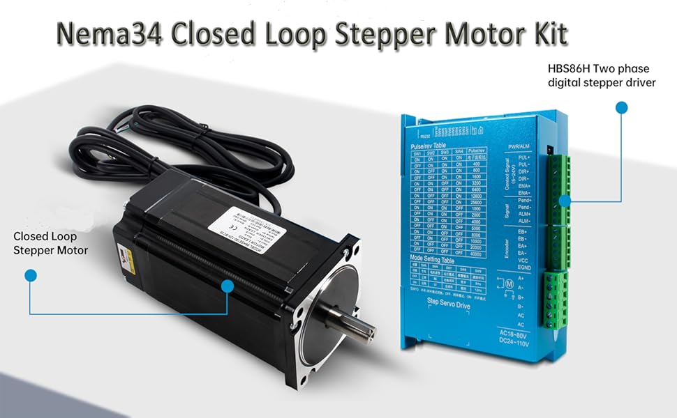 【HBS86H V4 Driver】Power supply voltage: 18-80AC; Control mode: pulse control; Maximum output current: 6.0A; Step pulse width: 400KHZ; Maximum adjustable subdivision: 51200 pulses/revolution; Waterproof: IP20; Encoder line count: 1000CPR