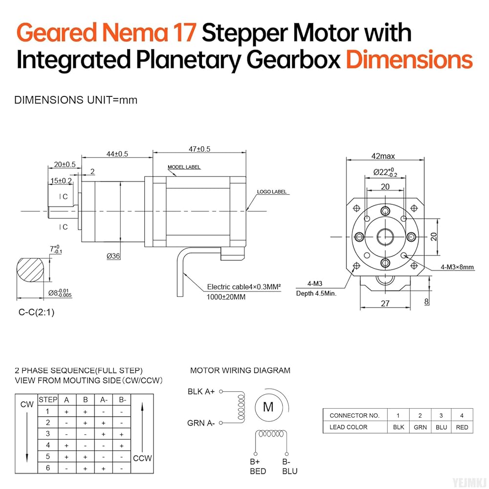 Specifications: Dimensional parameters of 50.9:1 Geared nema 17 stepper motor with integrated planetary gearbox are as follows. Body size 42x42x91mm (1.66x1.66x3.59in), Shaft length 20mm, Shaft diameter Ø8mm, D-cut length 15mm, Lead color Black (A+) Green (A-) Red (B+) Blue (B-), with Cable 1M, Weight 636g.