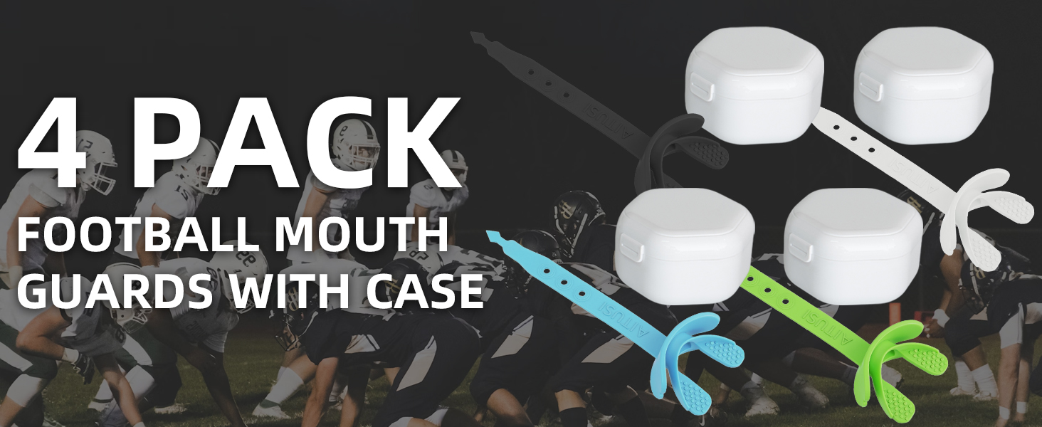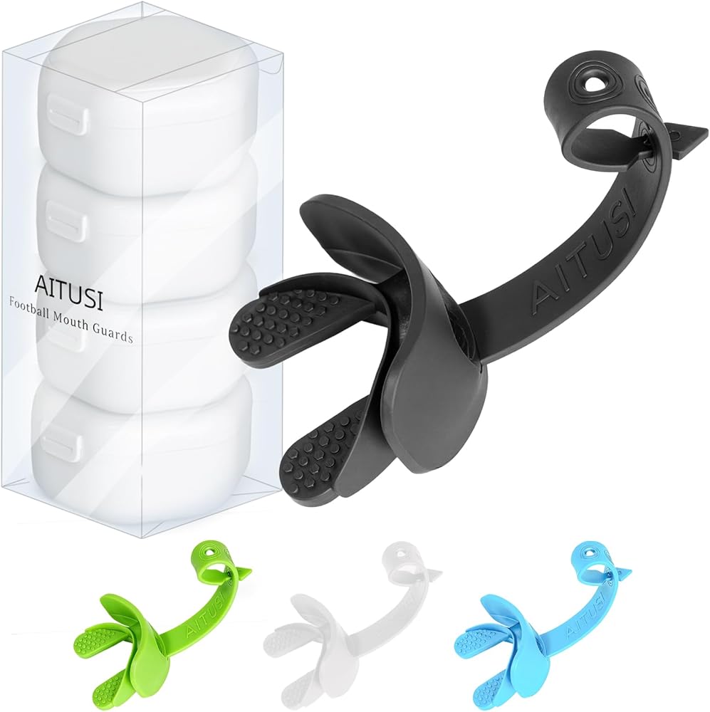 【4-Pack Football Mouth Guards with Strap】- Protect your teeth during intense football games with AITUSI's 4-Pack Football Mouth Guards with Strap. Each set includes 4 durable mouthpieces (Black/White/Blue/Green), ensuring a fresh guard for every game. The adjustable strap keeps the mouthguard securely in place, preventing slips during tackles or sprints. Ideal for youth & adult athletes, these sports mouthguards offer reliable impact absorption.
