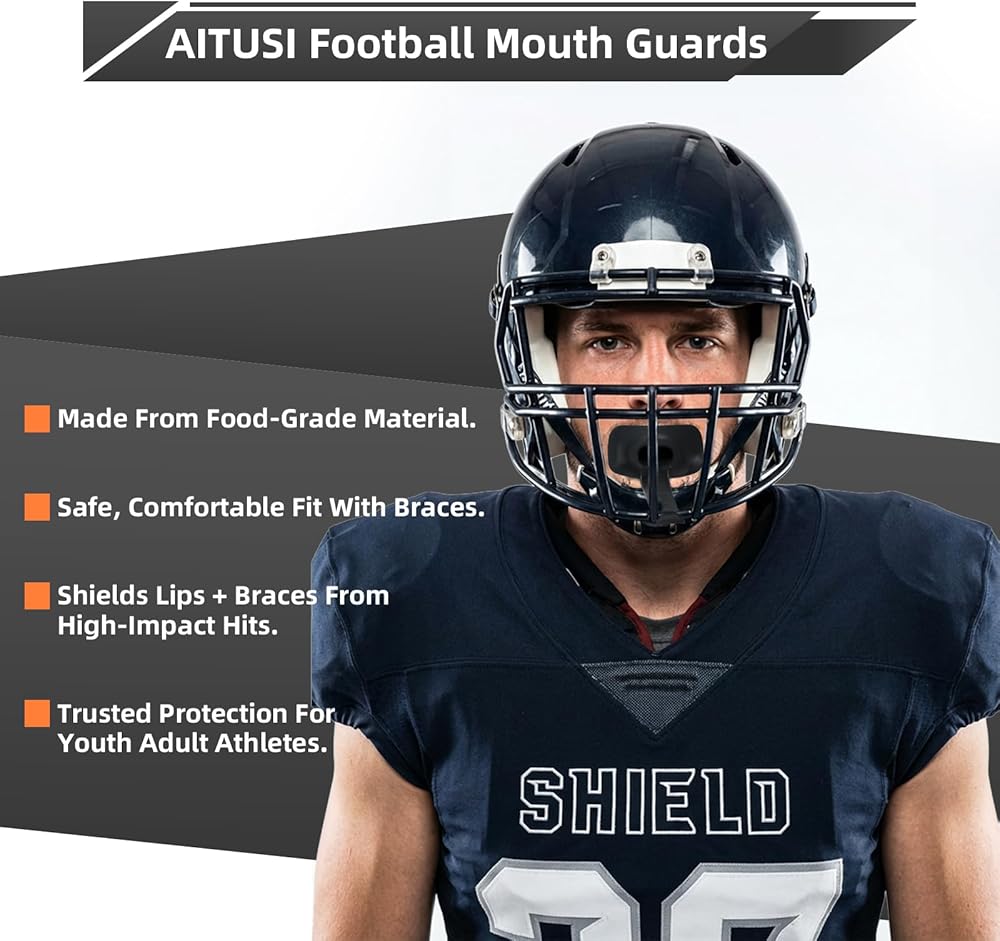 【Perfect for Youth & Adult Football Players】- AITUSI's football mouth guards are sized for youth & adult players, offering lightweight yet sturdy protection. The 4-pack variety ensures backups are always ready, and the straps add extra security during aggressive plays. Shop with confidence!!