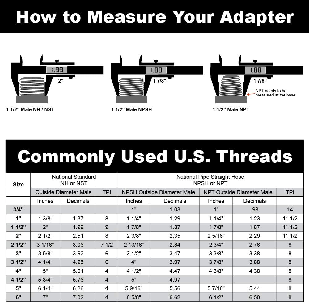 NPSH: National Pipe Straight Hose (NPSH) or Iron Pipe Thread (IPT) has the same threads per inch (TPI) as National Pipe Tapered (NPT) but the thread does not taper. NPSH is a straight thread and seals by a gasket in the female coupling which allows for a swivel, just like NH / NST, which make both ideal for hose couplings. Warning - It will NOT thread into a female NPT pipe. For example, a male NPSH coupling will NOT thread into a female metal or pvc pipe.
