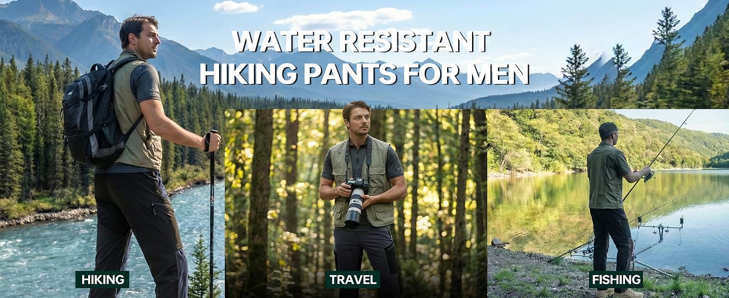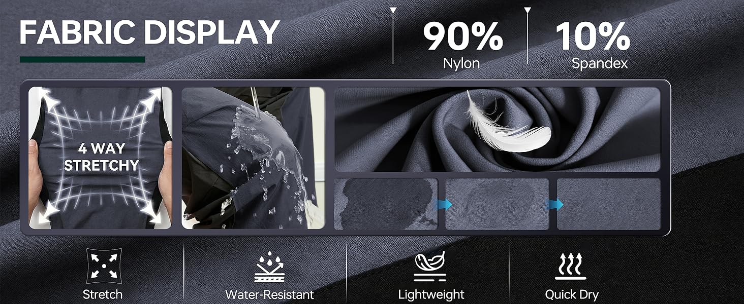 Water-Resistant & Quick-Dry: These mens hiking pants are crafted with water-resistant fabric, offering reliable protection against light rain, morning dew, and wet vegetation, so you can say goodbye to soggy, uncomfortable legs. Combined with quick-dry technology of travel pants, sweat and moisture evaporate rapidly, keeping you comfortable through intense hiking or sudden weather changes