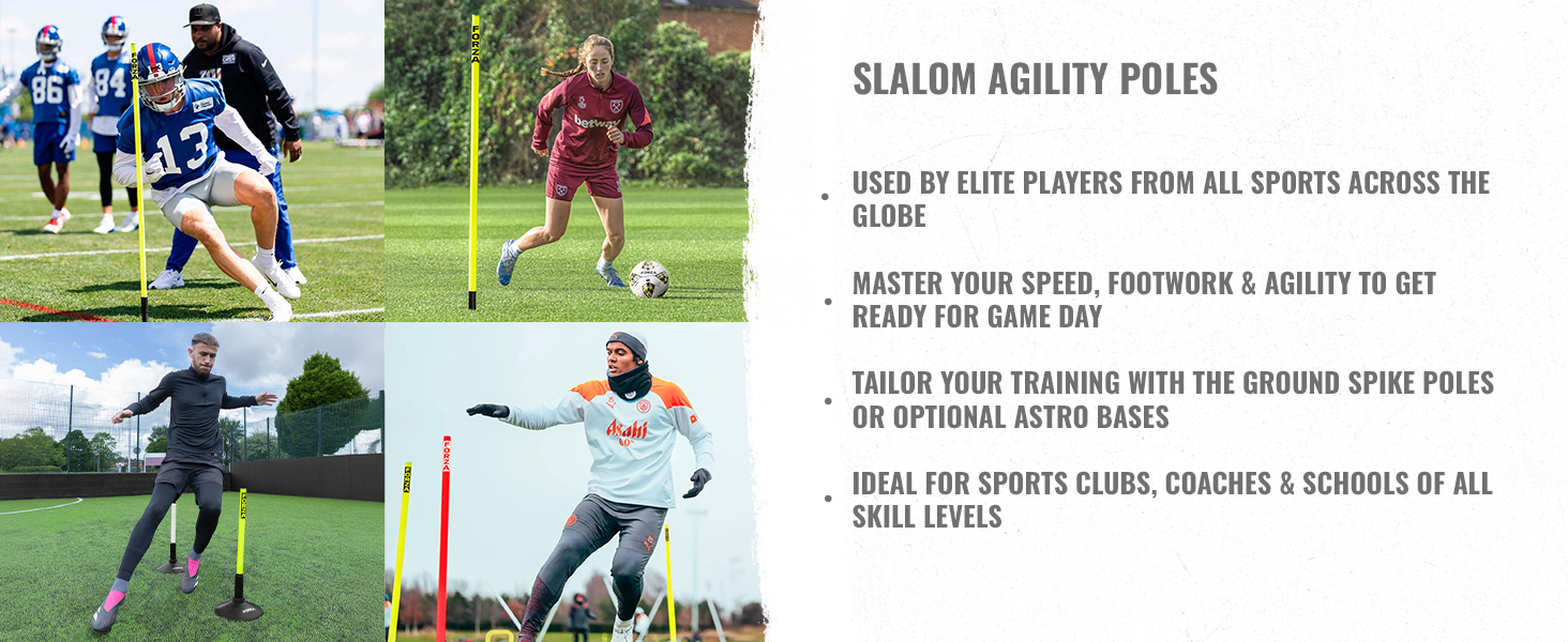 VERSATILE SURFACE USE - The stainless-steel spikes effortlessly penetrate grass pitches, ensuring stability during use. For those practicing on harder surfaces like AstroTurf, the optional Slalom Pole Rubber Bases [5lbs] offer a secure alternative without compromising the safety features that these agility poles provide.
