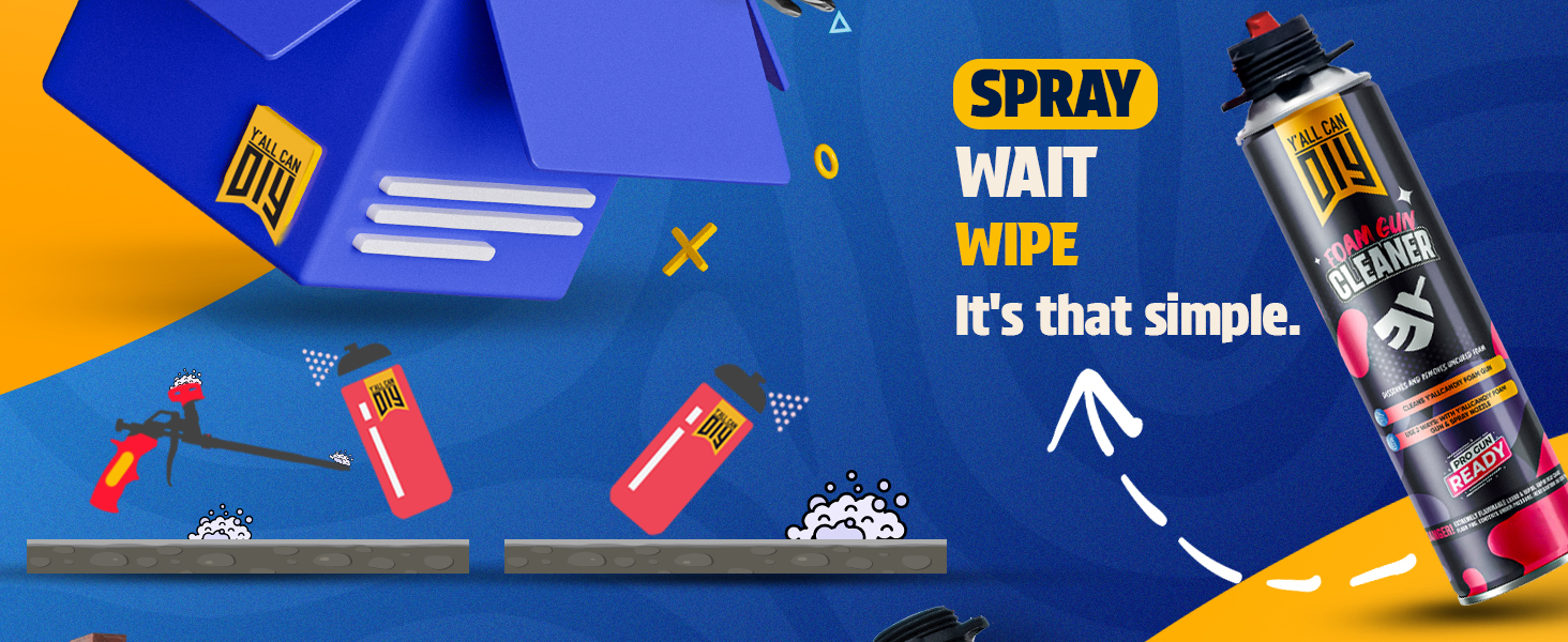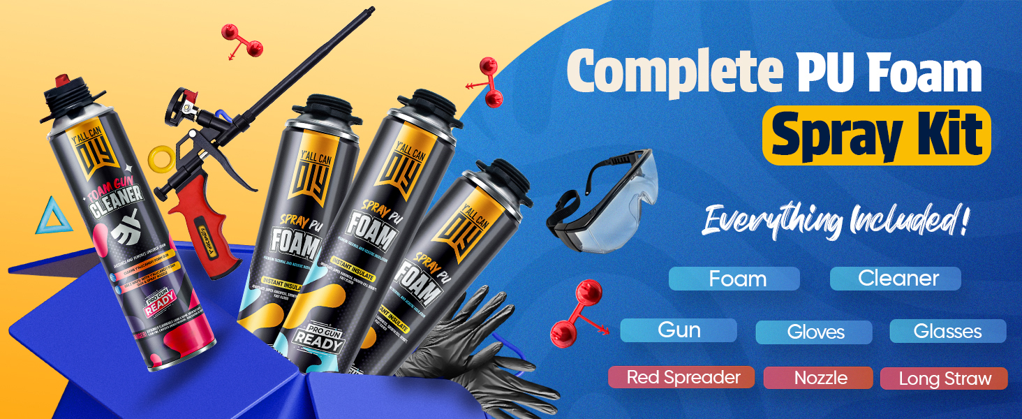 Comprehensive Set: Includes 12 cans of 33.8 fl.oz (1000ml) expanding foam, each with its own gun straw and red spreader. PACKAGE CONTENTS - Y'allCanDIY Kit Pack of 12 includes everything you need: 12 Expanding Foam Can, 2 PU Foam Gun Cleaner, 2 Teflon coated PU Foam Gun, 12 pairs of nitrile Gloves, 2 pair of Safety Glasses, 2 Respiratory Mask, 2 Safety Suit Coverall, 12 gun straws, 4 long straws, 4 nozzles and 12 red spreaders (For use with foam gun)