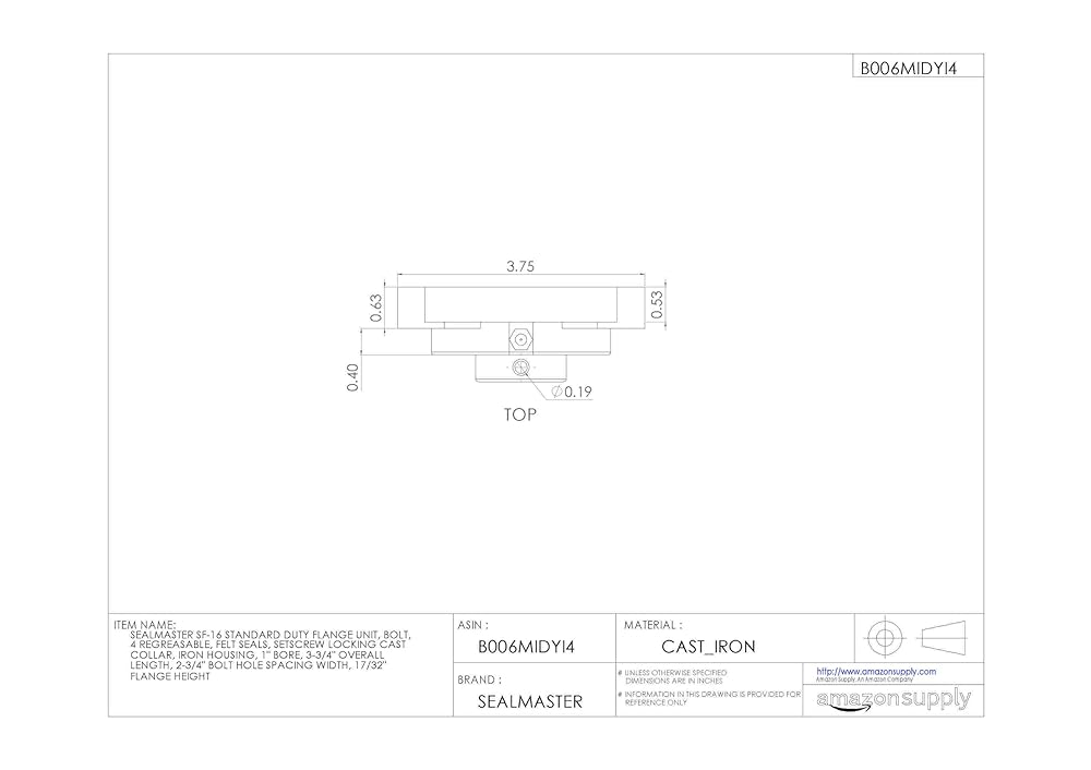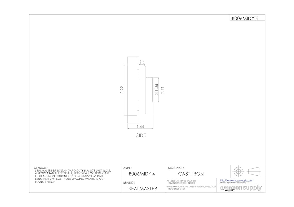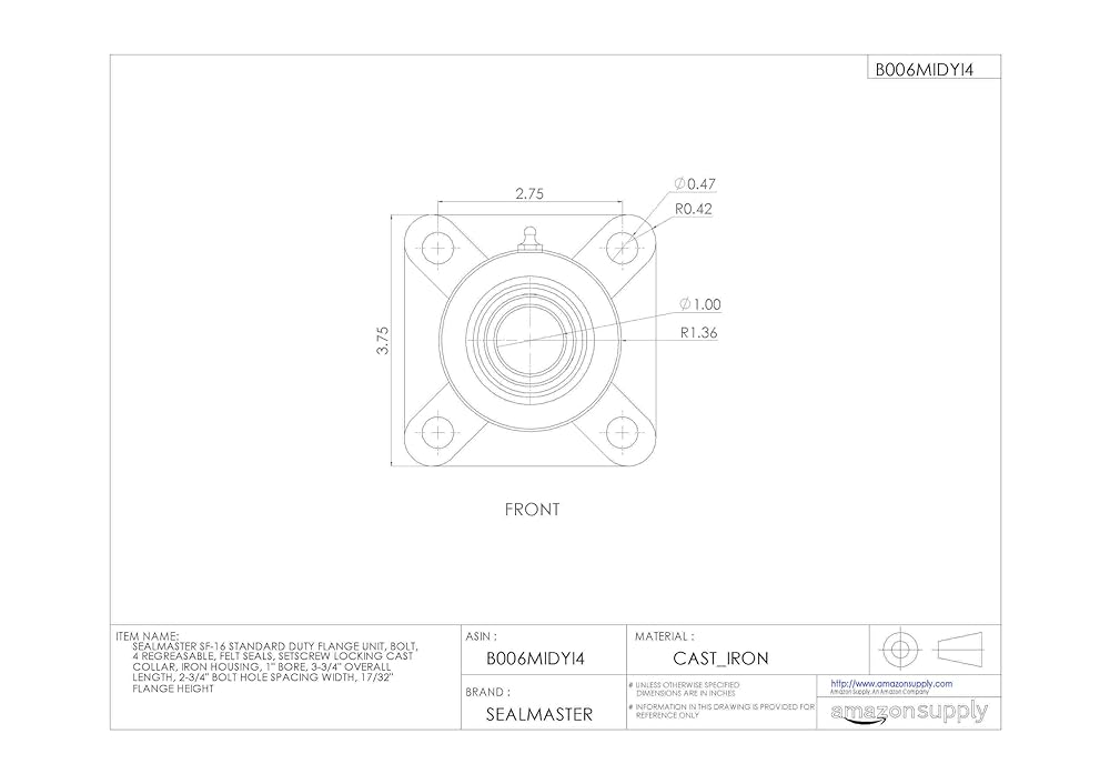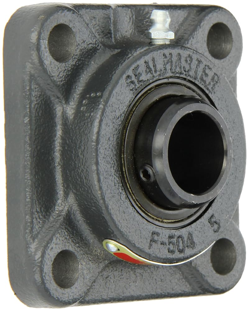 This Sealmaster SF standard-duty flange unit has a cast iron housing with four bolt holes, felt seals, and setscrew locking collar. It is designed for mounting onto bearing surfaces perpendicular to the shaft axis. The one-piece housing has machined foot pads and is made of solid cast iron for rigidity and vibration damping. It is equipped with a grease fitting on the outer surface for reapplying lubricant. A locking pin-and-dimple system feeds oil through the bearing and prevents outer-ring rotation within the housing. The double-sealed, deep-groove ball bearing cartridge insert in the housing is rated "standard duty" for applications with moderate radial loads and light to moderate thrust or combination loads. The bearing is made of vacuum degassed 52100 chrome steel, and the inner and outer races are coated with black oxide for corrosion resistance. The inner ring is extended to provide extra shaft support. A pin and dimple anti-rotation rivet on the outer ring prevents rotation of the ring in the housing, reducing heat buildup and prolonging the bearing life. This self-aligning bearing has a convex sphered outer surface that compensates for misalignments. Low-friction felt labyrinth seals on both sides of the bearing retain lubricant applied at manufacture and help keep contaminants out. For added protection, flingers on the inner ring deflect contaminants away from the seals. The bearing locks onto the shaft with two setscrews spaced 120 degrees apart for a three-point contact hold. This lock type minimizes ring distortion and vibration and is suitable for low to moderate speed applications where the shaft rotates in a single or reversing direction. Flanged bearing units are suitable for use in industrial and commercial applications including conveyors, fans and blowers, construction machinery, and processing equipment, among many others.