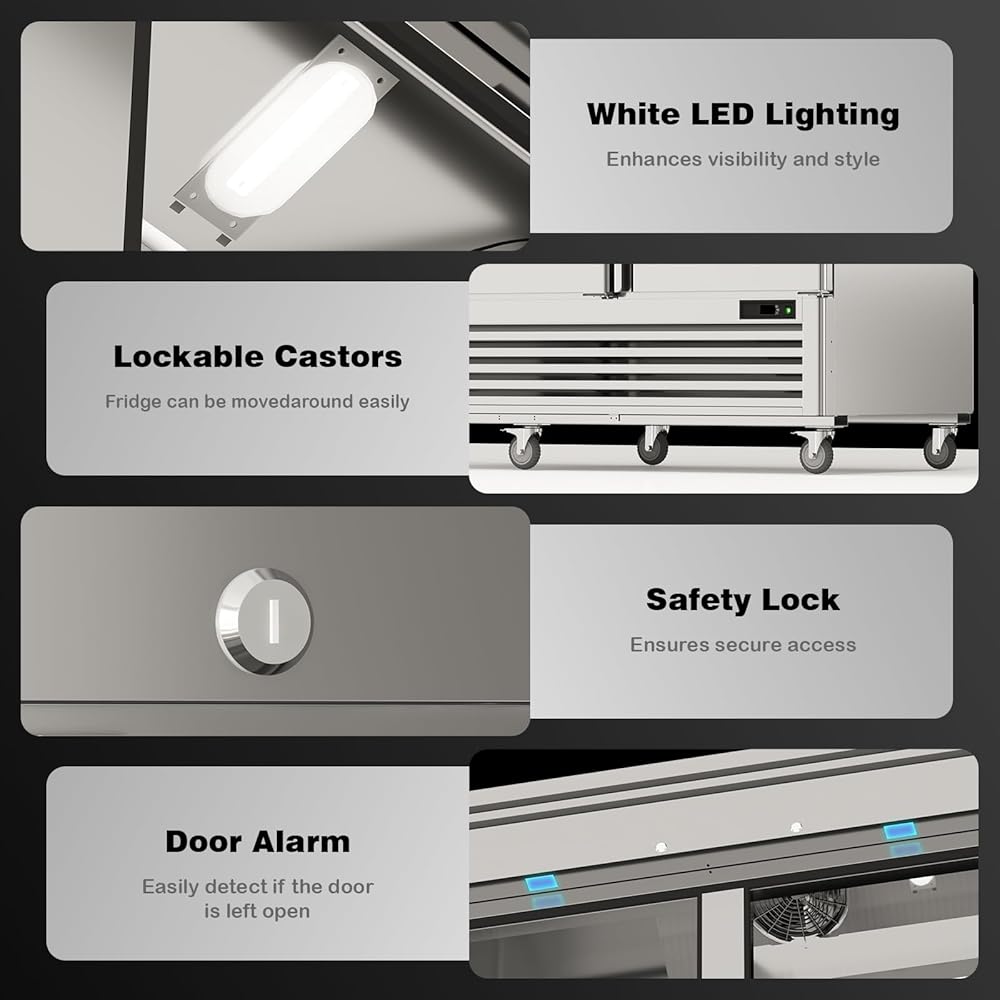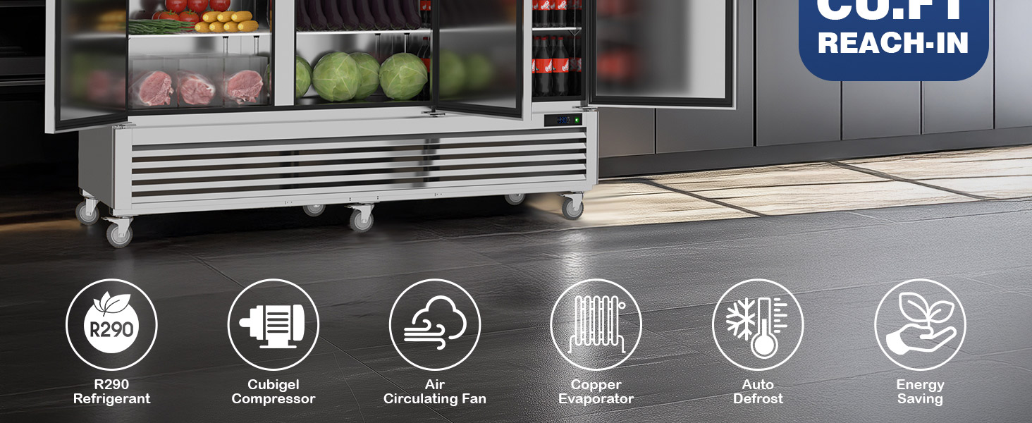 Optimal Cooling Performance: Equipped with advanced R290 refrigerant and an efficient compressor, our commercial refrigerator maintains a precise temperature range from 33℉ to 41℉, ensuring your food stays fresh while minimizing energy costs through its smart fan cooling system.Commercial reach-in refrigerator has a condensate evaporator, which removes the need for a floor drain connection.