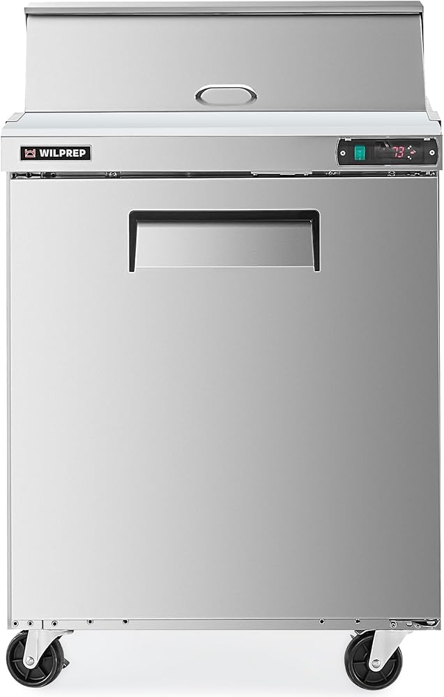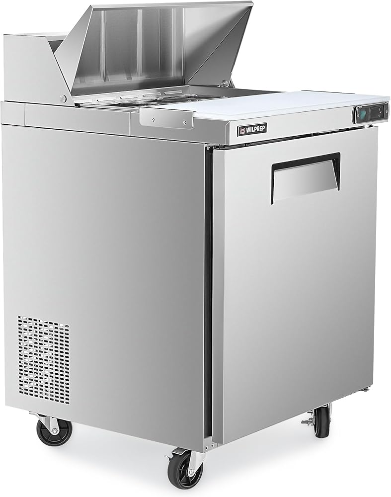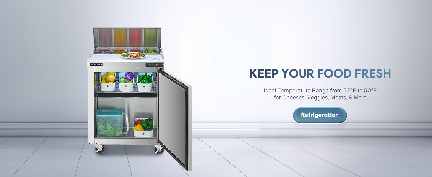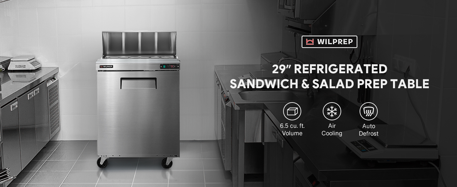 Keep Up with Customer Demands: Wilprep's 29" single-door refrigerated sandwich prep table features a 6.5 cu. ft. volume, a full-length cutting board, and 8 GN 1/6 pans offer ample space for a smooth sandwich, salad preparation, and backup ingredient storage.
