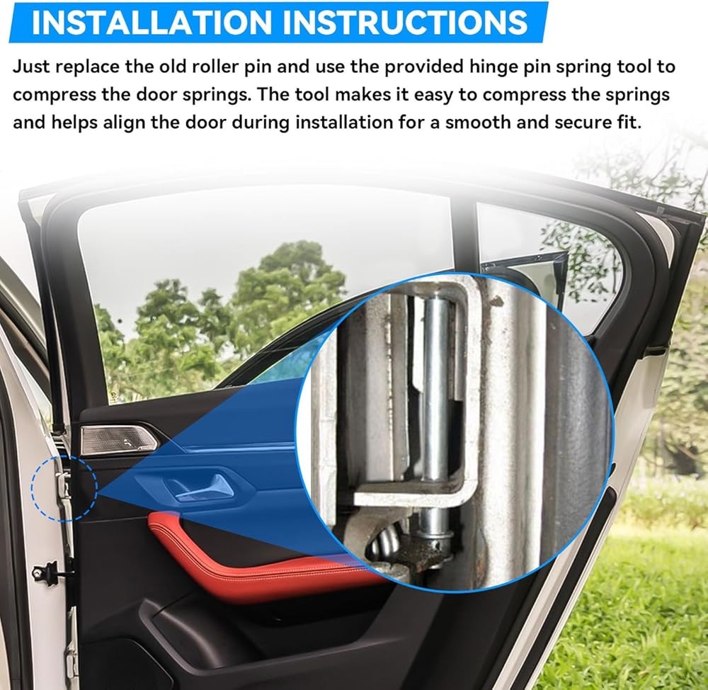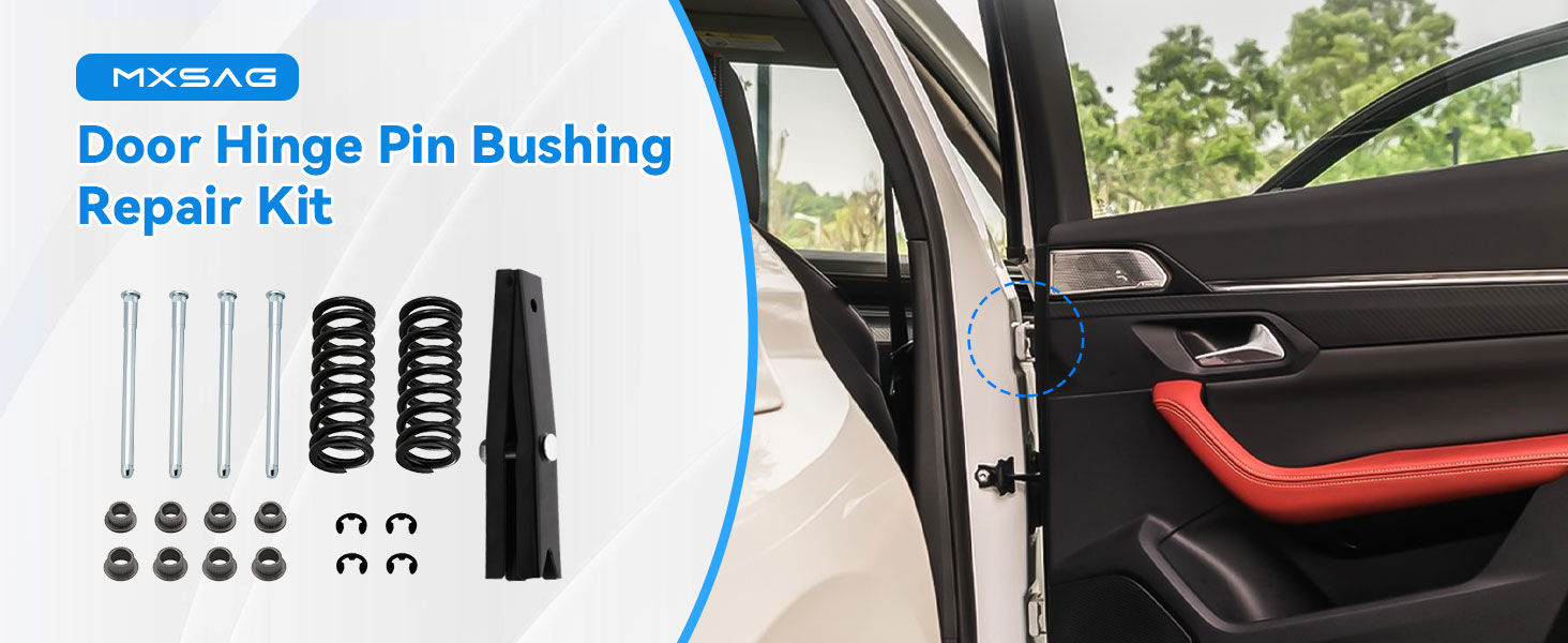 Package Includes 4pcs Door Hinge Pins, 4pcs E-ring Clips, 8pcs Bushings, 2pcs Door Hinge Springs, and 1pc Spring Compressor Tool. We offer two years of service