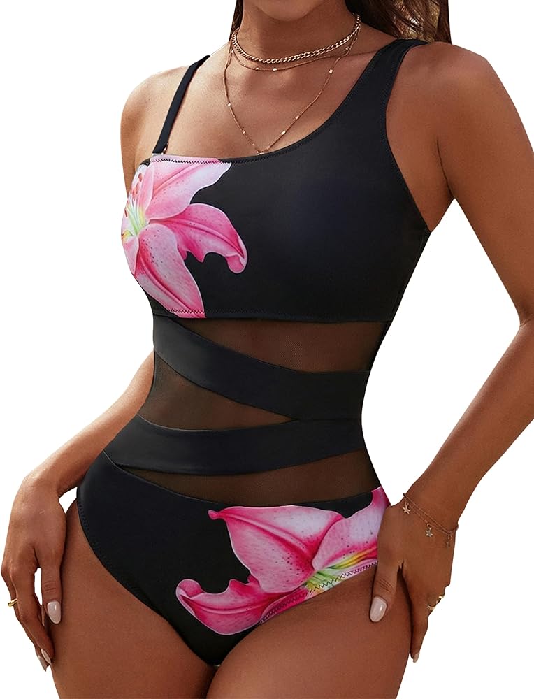 Features: Cute one shoulder one piece swimsuits features the mesh patchwork and see through hollow out style, comfy wide shoulder strap. Backless one piece swimsuit and classic slimming cut. Bathing suits for women, the long torso swimsuit adorably contours your curves.