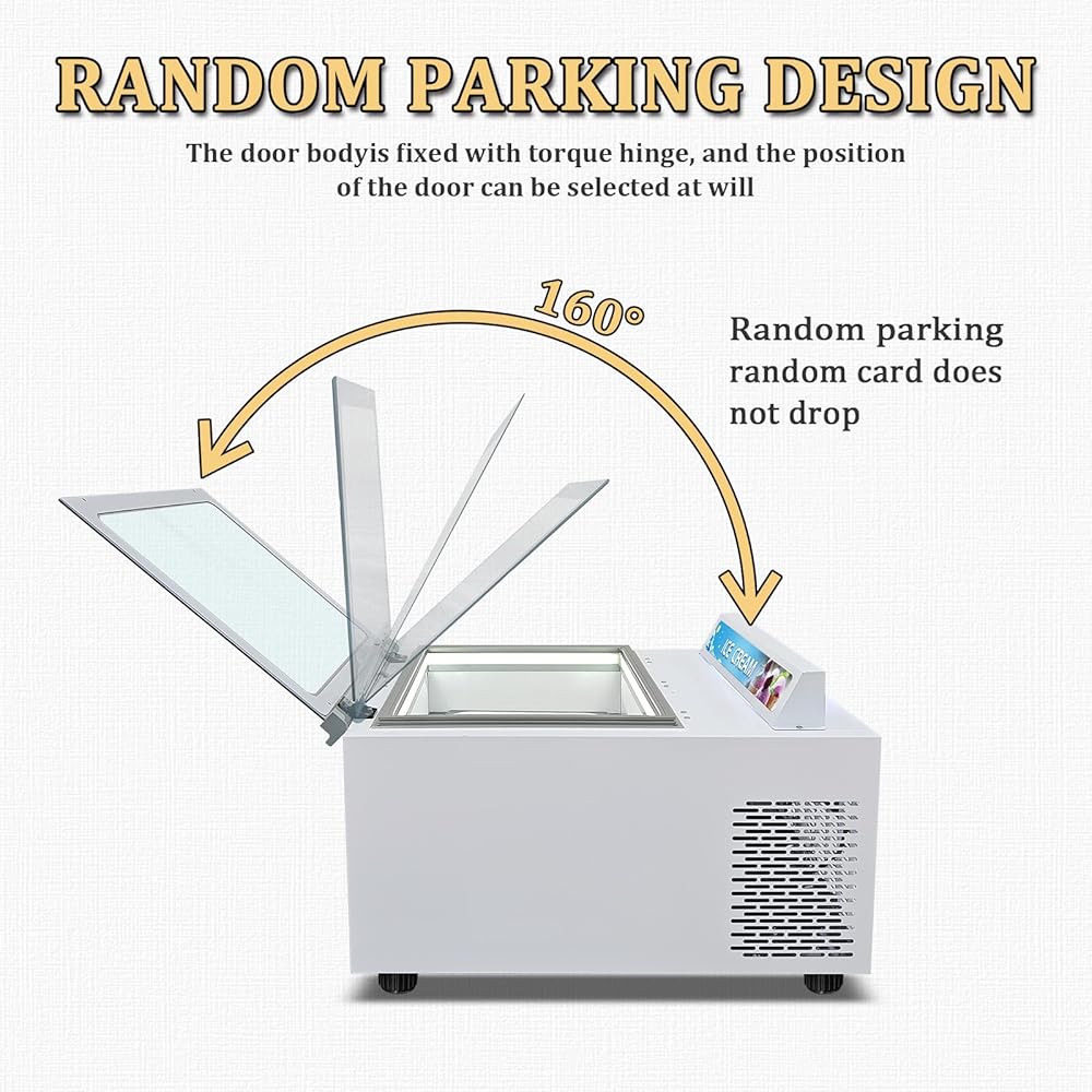 【Door Hover Design】Our ice cream display cabinet has backward opening design, Salesperson can easily select ice cream or food for customers, the glass door can hover freely when opened and closed, no need to support the glass door with hands, the glass door can be parked freely, this design significantly enhances work efficiency and convenient to place and remove the ice cream or other food from cabinet.
