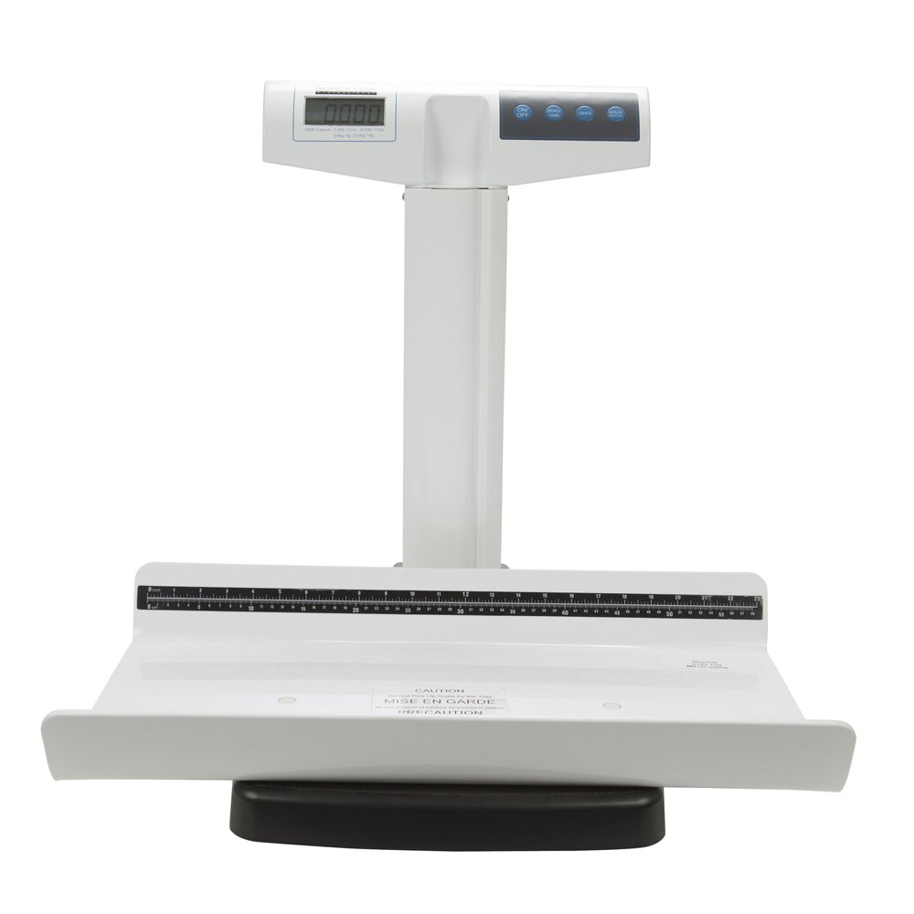 522KL Digital Pediatric Tray Scale has a capacity of 50 lb. / 23 kg and resolution of 0 - 20 lb. 0. 2 oz. / 20 - 50 lb. 0. 5 oz., 0 - 9 kg / 5g; 9 - 23 kg / 10 g. It has EMR connectivity via USB and a 1" LCD display. Functions: lb. / kg conversion, lb. /kg lockout, Zero Out / Tare, Hold / Release, Auto Zero, Auto Off. Sanitary easy-to-clean tray measures 24 1/16" W x 14 1/8" D x 3" H. Built-in Measuring Tape: 0" - 23" / 0 cm - 58 cm, six AA batteries included, Optional 120V adapter (order # ADPT31). , Lot of 1
