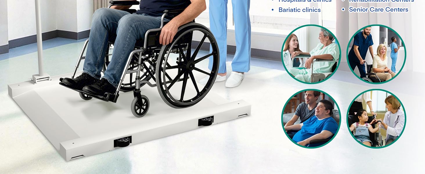 WIDE STABLE PLATFORM FOR CLINICAL SETTINGS Large non-slip surface designed to accommodate standard and bariatric wheelchairs, providing secure positioning during weight checks and routine patient assessments.