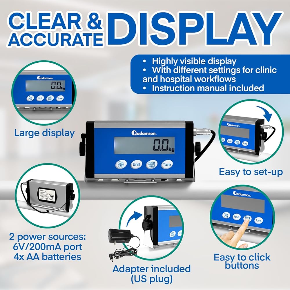 CLEAR LCD INDICATOR FOR CAREGIVERS High-visibility display with instant readings, HOLD function, auto-zero, TARE, and lb/kg switch—optimized for nursing workflows and quick patient throughput.
